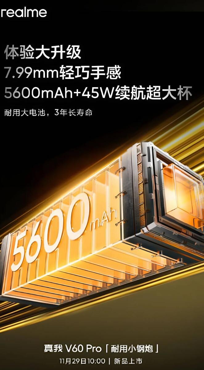 29 ноября компания Realme выпустит ударопрочный смартфон V60 Pro с аккумулятором 5600 мАч