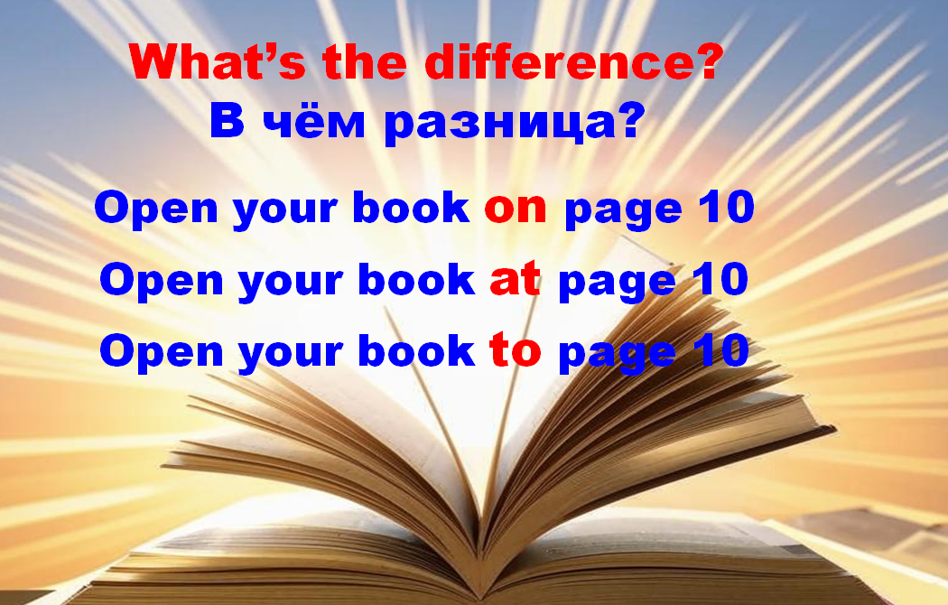 Open your book on page 10: Это подразумевает, что книга должна быть открыта и читатель должен смотреть на страницу 10. Это менее распространено в американском английском, но более принято в британском.