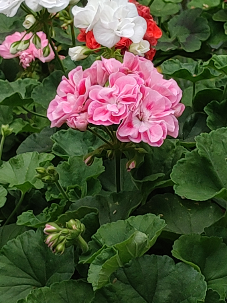 В этом году я еще внимательнее к ней присмотрелась и показала народу на августовской выставке в Аптекарском огороде, где многие посетители ее отметили. В третьем поколении эта дамочка стабильно передает все сортовые признаки и я выпускаю ее в свет! Итак, встречаем Ода Королева Шантеклера!Кстати, вот с ее именем вообще никакой заминки не было. Первая же ассоциация была с кабаре. Сорт по размеру - компактный стандарт, лист средне зеленый, соцветия среднего размера, набитые. Очень легко формируется в круглый кустик. Цветоносы короткие. Цветы махровые, лепестки розового цвета с растяжкой до белого, с малиновым напылением, которое на верхних лепестках ярче и крупнее, чем на нижних. В центре цветка белый глазок. Цветение обильное. Сорт абсолютно не прихотлив, легко укореняется. Фото почему-то все так себе. В реальности он лучше. Кстати, вот на видео, мне кажется, получилось передать его рюши. Зато форма куста как раз на фо