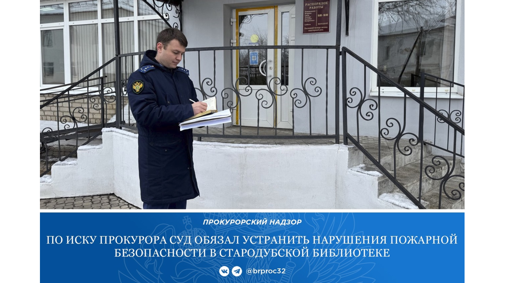В Стародубе прокуратура выявила нарушения пожарной безопасности в центральной библиотеки. В ходе проверки выяснилось, что в учреждении не проводятся испытания средств обеспечения пожарной безопасности, коридор второго этажа не отделен от лестничной дверьми. Также отсутствует наружная эвакуационная лестница. Надзорное ведомство вносило представление об устранении нарушений. Однако, библиотека его проигнорировала. Тогда прокуратура обратилась в суд. Администрацию Стародубского муниципального округа обязали устранить нарушения до 1 марта 2025 года. В Стародубе суд обязал устранить нарушения пожарной безопасности в библиотеке