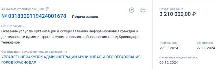 На сайте госзакупок запущен электронный аукцион на оказание услуг по организации и осуществлению информирования жителей о деятельности администрации Краснодара в телеэфире. Заказчиком, естественно, выступает сама мэрия города.