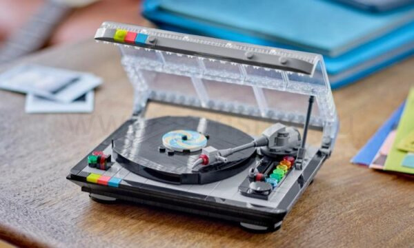 Там даже есть подвижный рычаг тонармы (правда, он не поднимает и не опускает тонарму), регулировка громкости, украшенный центральный элемент, более чем достаточно цветных кнопок и напечатанных плиток, а также виниловая пластинка, которую вы сможете собрать, возможно, это редкое британское издание The White Album (проверка заметок – нет, это всего лишь Лего, извините.)