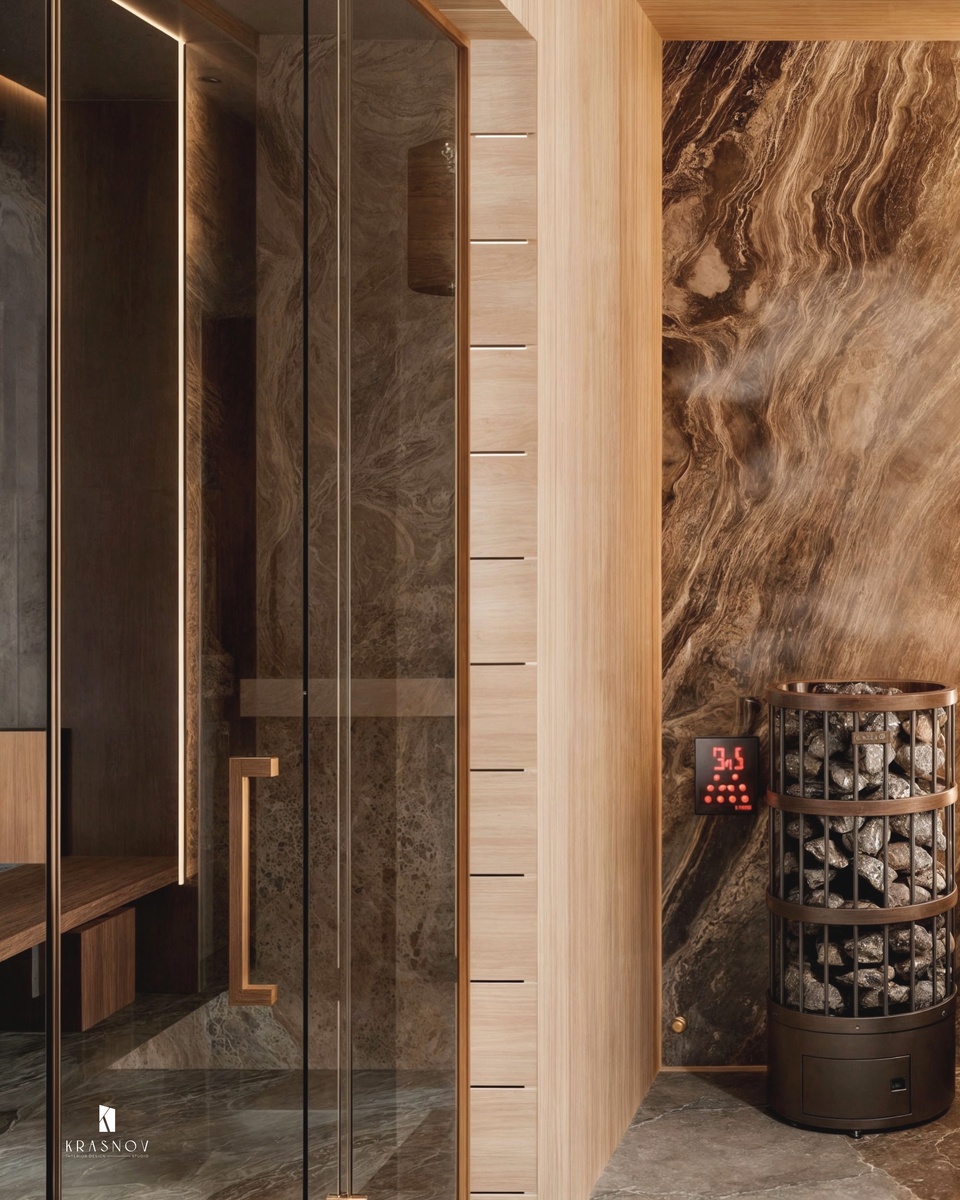 Нечасто нам приходится создавать дизайн для сауны. Но в проекте Дача Винтера не обошлось без нее 🏡 Получилось очень современное и изысканное помещение. Латунные и деревянные элементы отсылают нас к классическому образу сауны. В отделке использовали преимущественно керамогранит с фактурой мрамора. Его сбалансировали деревянными полками и панелями. Сауна – это место для полноценного расслабления, поэтому стояла задача за счет освещения создать необходимую атмосферу: сделали дополнительную подсветку на полках и в парильном отделении. А как вам такой дизайн? Поделитесь мнением в комментариях 👇 Больше пользы и классных интерьеров в Телеграм канале студии krasnov_d - https://t.me/+XuhDDI9cYlo4MjIy #сауна #дизайнсауны #саунавкоттедже