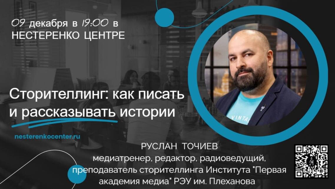 Истории есть у всего. У каждого человека, события, города, здания, предмета… Даже у вкуса и запаха есть своя история. Ее можно рассказать словами, изображениями или звуками. Все, что окружает нас, - это истории. Когда вы знакомитесь с новыми людьми или встречаетесь со старыми друзьями, проходите собеседование или сдаете экзамен, вспоминаете ночной сон или смотрите кино, слушаете музыку, читаете стихи или разглядываете картину, смотрите в окно или пишите пост в социальных сетях, - на самом деле вы рассказываете или воспринимаете историю. Рассказать историю любым языком, будь то предложения, видеоряд или музыкальная фраза, так, чтобы вызвать интерес и эмоции, - это искусство. Изучать его будем на новом интенсиве по сторителлингу. Он завершит наш проект «Лаборатория креативных компетенций». Ждем всех с 9 по 13 декабря в 19:00 в арт-пространстве Нестеренко центра. Регистрация открыта по ссылке Всю следующую неделю будем посвящать вас в подробности. Проведите пять зимних вечеров в нашей ком