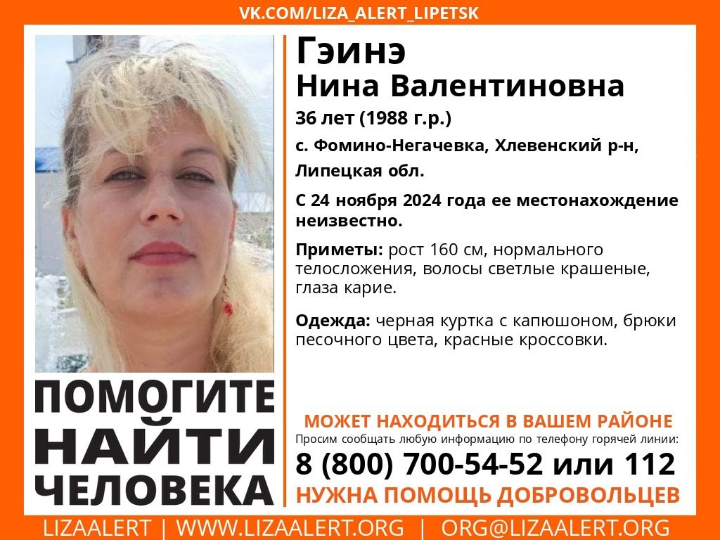 В Липецкой области пятый день ищут 36-летнюю Нину Валентиновну Гэинэ. Согласно ориентировке, женщина ушла из дома в селе Фомино-Негачевка Хлевенского района в минувшее воскресенье, 24 ноября. С тех пор о ее местонахождении ничего не известно. Помочь в поисках пропавшей просят волонтеры поисково-спасательного отряда «Лиза Алерт». Приметы: рост 160 сантиметров, нормальное телосложение, светлые крашеные волосы и карие глаза. В день исчезновения была одета в черную куртку с капюшоном, песочного цвета брюки и черные кроссовки. Всех, кто видел пропавшую или что-то знает о ее возможном местонахождении, просят позвонить по телефонам: 112 или 8 (800) 700-54-52.