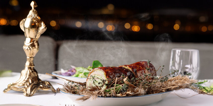 Во время создания блюда театрально-гастрономический дуэт вдохновлялся анекдотом, взятым за основу написания "Шинели": истории, которая при Гоголе была рассказана Пушкину. "Шинель М" - соединение танца и драмы, музыки и вокала. Режиссёр и хореограф-постановщик танц-драмы Юрий Смекалов переосмысливает гоголевский сюжет, помещая его в эпоху Мейерхольда. Это история о чиновнике, который во время охоты в тростниковых камышах потерял своё ружьё. Именно поэтому в основе блюда использована дичь. Для приготовления рулета из цесарки требуется два вида мяса: тёмное и белое. Грудка цесарки со сливками и зеленью взбивается в мусс и охлаждается. Тёмное мясо птицы отбивается до тонкого мясного слоя, на который наносится охлаждённый мусс, и заворачивается в рулет. Затем запекается в пароконвектомате в течение 30 минут. Готовое блюдо не только дополняется пюре из свёклы с ферментированной сливой и яблоком, как метафора яркой эпохи Мейерхольда, но и декорируется маслом и чипсами из шалфея, а также жарен