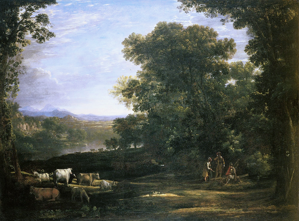 Во время своих путешествий французский живописец Клод Лоррен (1600–1682) недолго останавливался в Марселе, Генуе и Венеции, и имел возможность подробно изучить сельскую местность Франции, Италии и Баварии. Историк искусства Иоахим фон Зандрарт, познакомившись с Лорреном в конце 1620-х годов, писал, что к тому времени у художника появилась привычка рисовать на открытом воздухе, особенно на рассвете и в сумерках, создавая этюды маслом на пленэре. Одна из первых датированных картин Клода Лоррена «Речной пейзаж» (1629), хранящаяся в настоящее время в Музее искусств Филадельфии, уже демонстрирует хорошо проработанный стиль и технику. Полотно свидетельствует о раннем увлечении художника натурализмом: с самого начала своей карьеры Лоррен был заинтересован в том, чтобы как можно точнее изобразить природу. Каждое дерево индивидуально, со своими особыми характеристиками. Картина также отличается новаторством в использовании света. Падающий на спины животных свет, светящиеся полосы на пастухах и