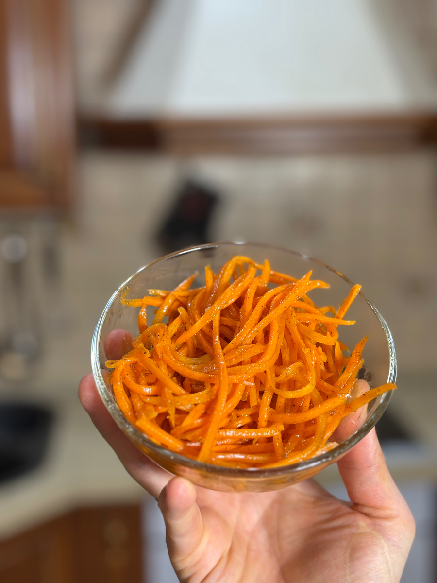 Пошаговый рецепт Подготовьте ингредиенты: ✅морковь 600 гр ✅чеснок 3 зубчика ✅подсолнечное масло 100 мл ✅острый красный перец 1/2 столовой ложки ✅кориандр 1/2 чайной ложки ✅перец черный молотый 1/4 столовой ложки ✅уксус 70% 1/2 столовой ложки ✅соль 1/2 столовой ложки ✅сахар столовая ложка Шаг 1 Натрите морковь на терке соломкой или нарежьте и посолите, перемешайте и оставьте на 15 минут Шаг 2 Масло разогрейте до кипения в сковороде или сотейнике с красным острым перцем постоянно помешивая, как только масло закипит сразу уберите с огня Шаг 3 Слейте с моркови выделившийся сок Шаг 4 Мелко нарежьте чеснок Шаг 5 Добавьте к моркови черный перец, кориандр, сахар, уксус, чеснок, вылейте масло и хорошо перемешайте #рецепты #foodблогер #еда #морковьпокорейски
