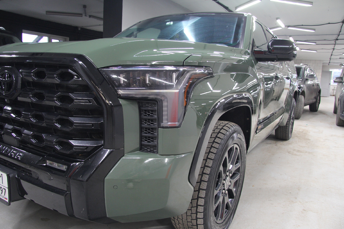 Клиент обратился с просьбой заменить старую защитную плёнку на лобовом стекле Toyota Tundra. Прежняя плёнка находилась в плохом состоянии: на ней были глубокие царапины, особенно заметные в зоне работы дворников.