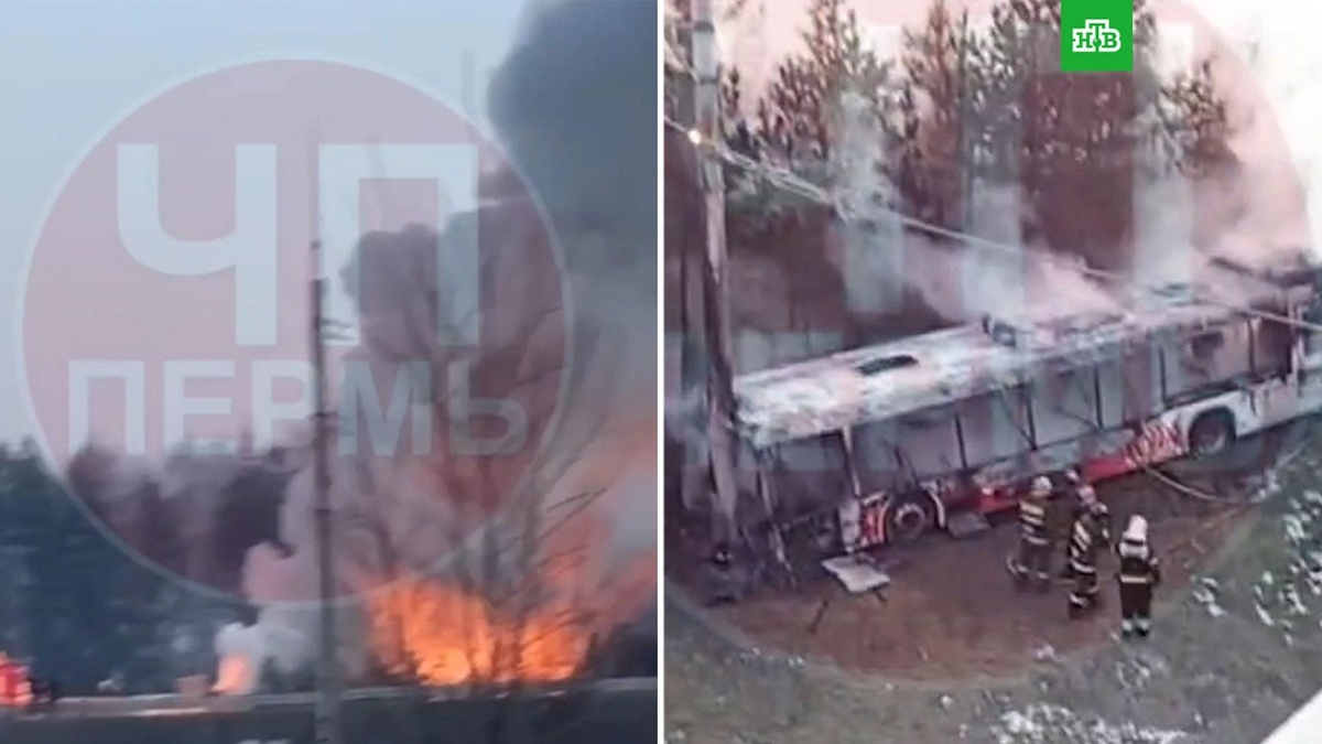 В Перми пассажирский автобус съехал с дороги на железнодорожные пути, задел провода и загорелся. Очевидцы сняли на видео последствия ДТП.