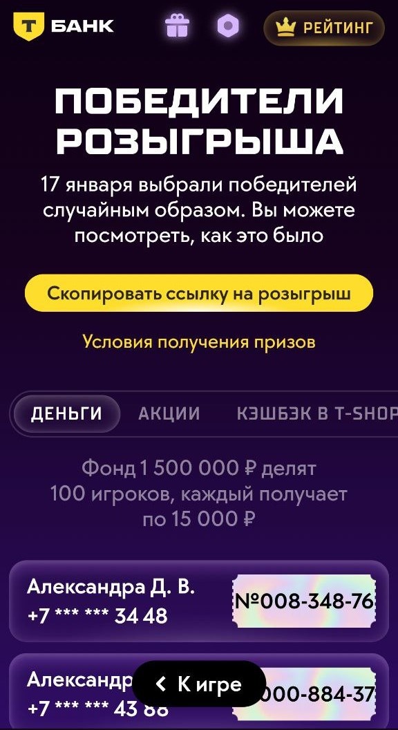 ✅ Призовой фонд 1 500 000 ₽ разделили 100 игроков, каждый получил по 15 000 ₽.
