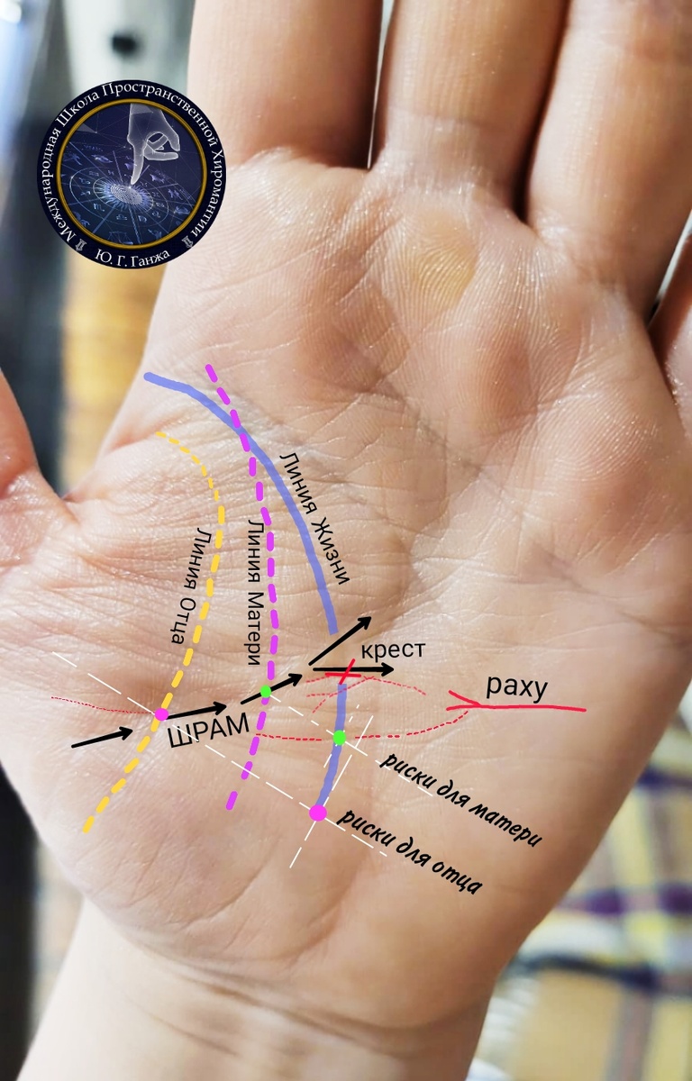 🖍Снова интересный практический пример со шрамом на руке. 🖍Область нахождения - холм Венеры. 🔹Как известно на холме Венеры расположены линии Влияния наших близких и родных людей, тех, кого мы впускаем в свою жизнь и с кем ее проводим. 🔹В данном случае на нем ярко проявлены линии Влияния матери и отца, которых сечет шрам и в точках пересечения наблюдаются негативные знаки - разрывы линии, секущие. Если провести проекции мест нарушения и повреждений на линию Жизни, то получим возраст на который приходятся эти риски. ☝Бросается в глаза и то, что линия Отца обрывается шрамом в том же возрасте, что и линия Жизни. А линия Жизни также отвечает и за жизнь и здоровье отца. 🔹Проходя, на своем пути шрам задевает и линию Жизни, образуя Раху на возрастах 35 и 38 лет. Все точки пересечения связаны со стрессовыми линиями, а на нижней еще и находится крестообразное пересечение, которое может давать риски для обладателя руки. 💯Все эти события необходимо подтверждать дополнительными