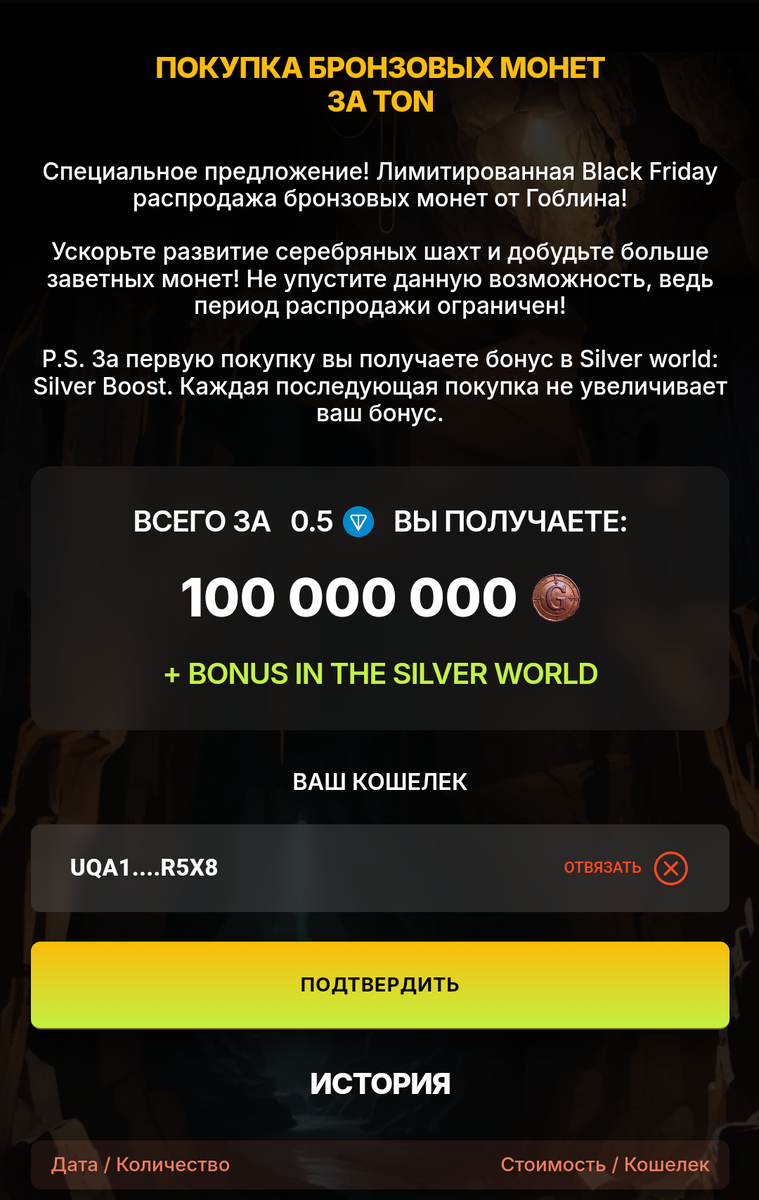 Долгожданная акция в Гоблине наконец началась! Специальное предложение! Лимитированная Black Friday распродажа бронзовых монет от Гоблина! Ускорьте развитие серебряных шахт и добудьте больше заветных монет! Не упустите данную возможность, ведь период распродажи ограничен! P.S. За первую покупку получаете бонус в Silver world: Silver Boost. Каждая последующая покупка не увеличивает ваш бонус Акция продлится ровно 72 часа Начинайте играть и не упустите выгодную акцию👇
