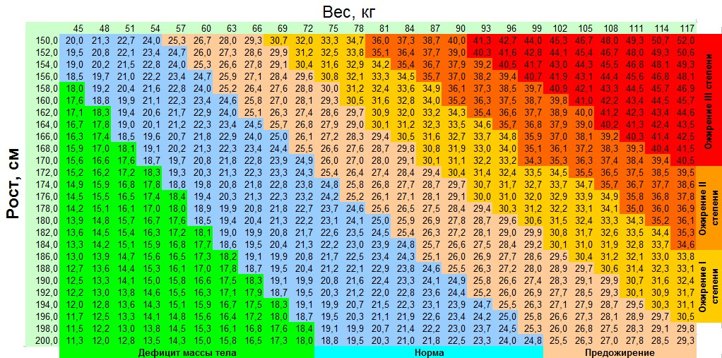 Индекс массы тела определяет соответствие веса человека росту и показывает, насколько это соответствие нормальное. Рассчитывается по простой формуле: вес в кг разделить на рост в метрах в квадрате. Например, мой рост 1,72 м, вес - 86,500. Делим 86,500 на 1,72*1,72 получаем ИМТ 29.24. Интересная штука эта таблица! Помню, как мы ее изучали еще в институте, учитывая в формуле каждый грамм. Тогда я считала себя ужасно толстой со своими 58 кг и очень хотела похудеть до 55. Очень удивлялась, что по таблице я тогда буду иметь недостаток веса. А уж как я боялась дойти до верхней границы нормы в 74 кг! Эх, мне бы их сейчас!Согласна на любую верхнюю границу. Сейчас на весах 86.500. Могло быть и меньше. У меня же недавно сломались весы (дочь их очень удачно пнула), и они начали показывать на 2 кг меньше. Как я была счастлива! Поделилась радостью с мужем. И он тут же пнул их еще раз. Знаете, наши суровые мужчины часто считают, что с техникой особо церемониться не стоит, с ней лучше разговаривать
