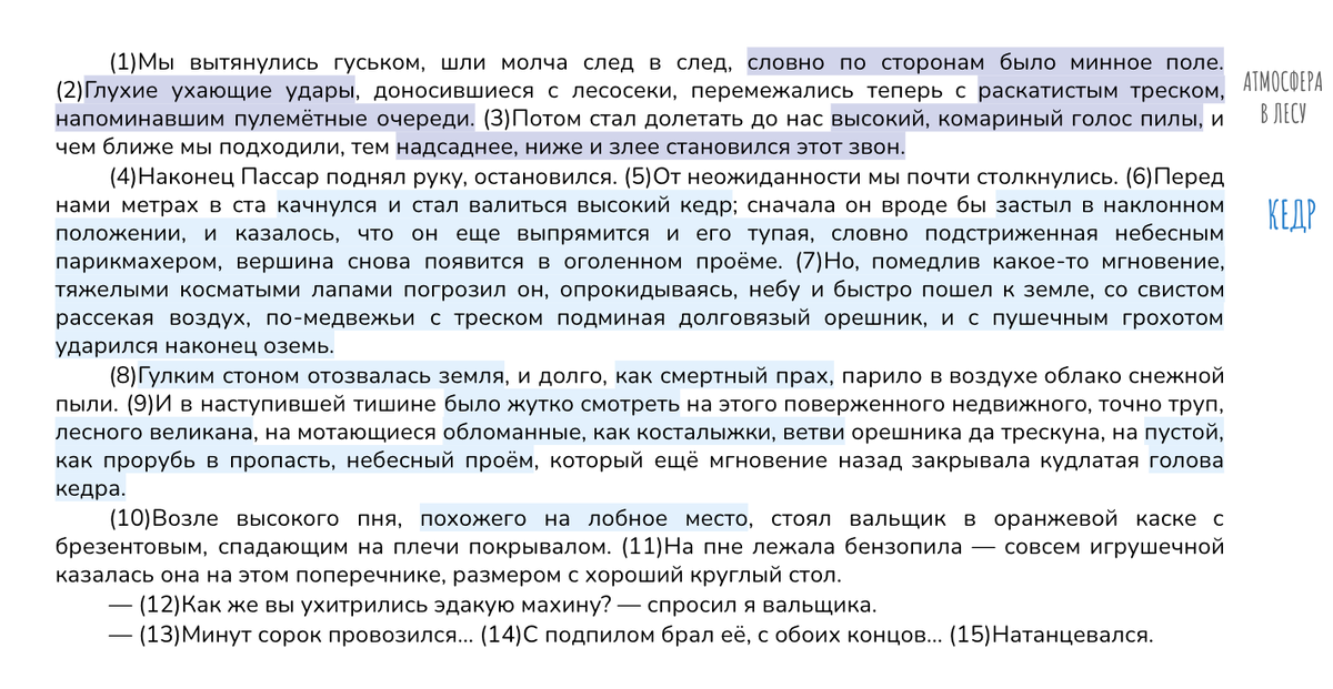 Чтобы доказать свою позицию, автор описывает немолодого вальщика, давно живущего в тайге. У «плотного», «коренастого» мужчины «немалой силы» дрожат пальцы после того, как он срубил величественный кедр. Вальщик стыдливо признаётся: «Повалишь такое вот дерево, как живую душу сгубишь». Много лет он не может привыкнуть к необходимости уничтожать деревья, чтобы заработать на жизнь. Становится понятно, что вальщик считает природу живым организмом и чувствует боль при виде её страданий.