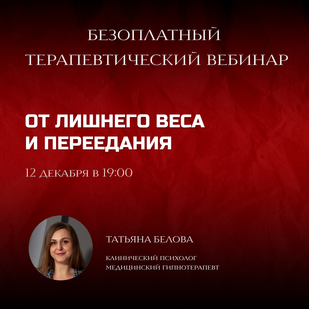 Если каждый день борьба с лишним весом кажется вам бесконечной, если вы уже перепробовали множество диет и тренировок, но так и не достигли желаемых результатов, возможно, пришло время взглянуть на проблему глубже... Этот терапевтический вебинар специально для вас! 🧑🏫 Ведущая: Татьяна Белова, опытный клинический психолог и гипнотерапевт. Дата и время: 12 декабря в 19:00 Стоимость: бесплатно. Для кого этот вебинар? ▪ Устали бороться с лишним весом и не видите результатов? ▪ Хотите понять, почему диеты и тренировки не работают? ▪ Готовы разобраться в глубинных причинах переедания и научиться контролировать свой аппетит? Что вы узнаете на вебинаре? ✅ Как внутренние конфликты влияют на вес; ✅ Почему одни легко держат форму, а другим приходится постоянно бороться; ✅ Как гипнотерапия помогает достичь желаемого результата; ✅ Как восстановить внутренний баланс и забыть про лишний вес навсегда. Почему стоит участвовать? 🟢 Получите ответы на волнующие вас вопросы; 🟢 Найдите мотивацию для зд