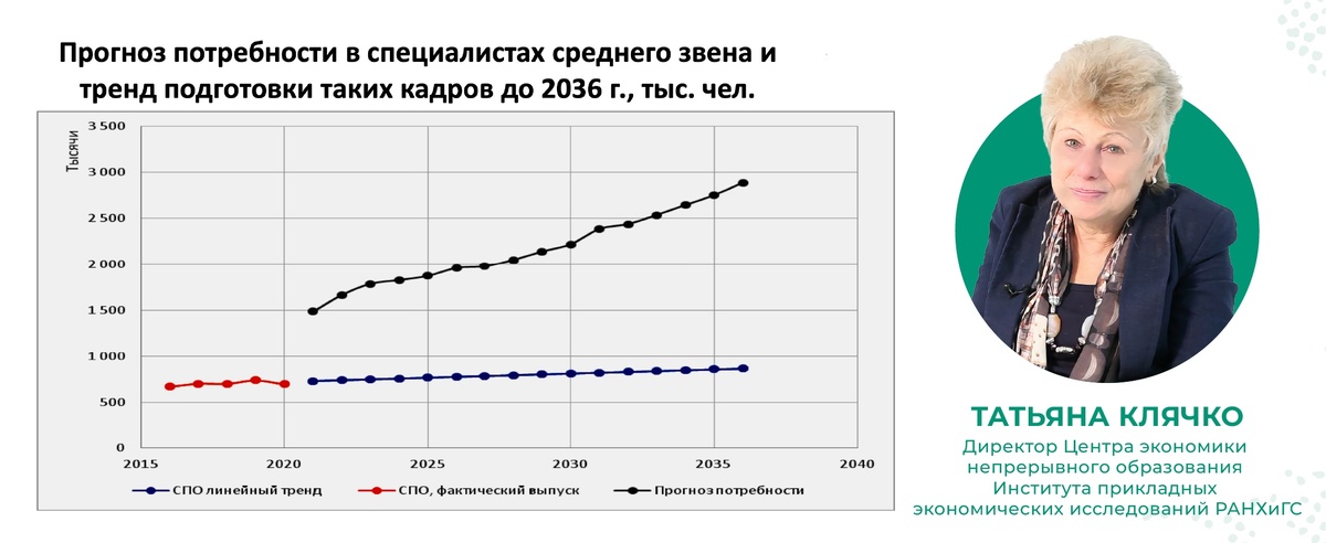 Очевиден тренд на уменьшение подготовки кадров с высшим образованием, а прогноз потребности с этим трендом резко расходится. Экономика говорит, что ей нужны кадры с высшим образованием. Система образования, к сожалению, не может пока соответствовать этому запросу.