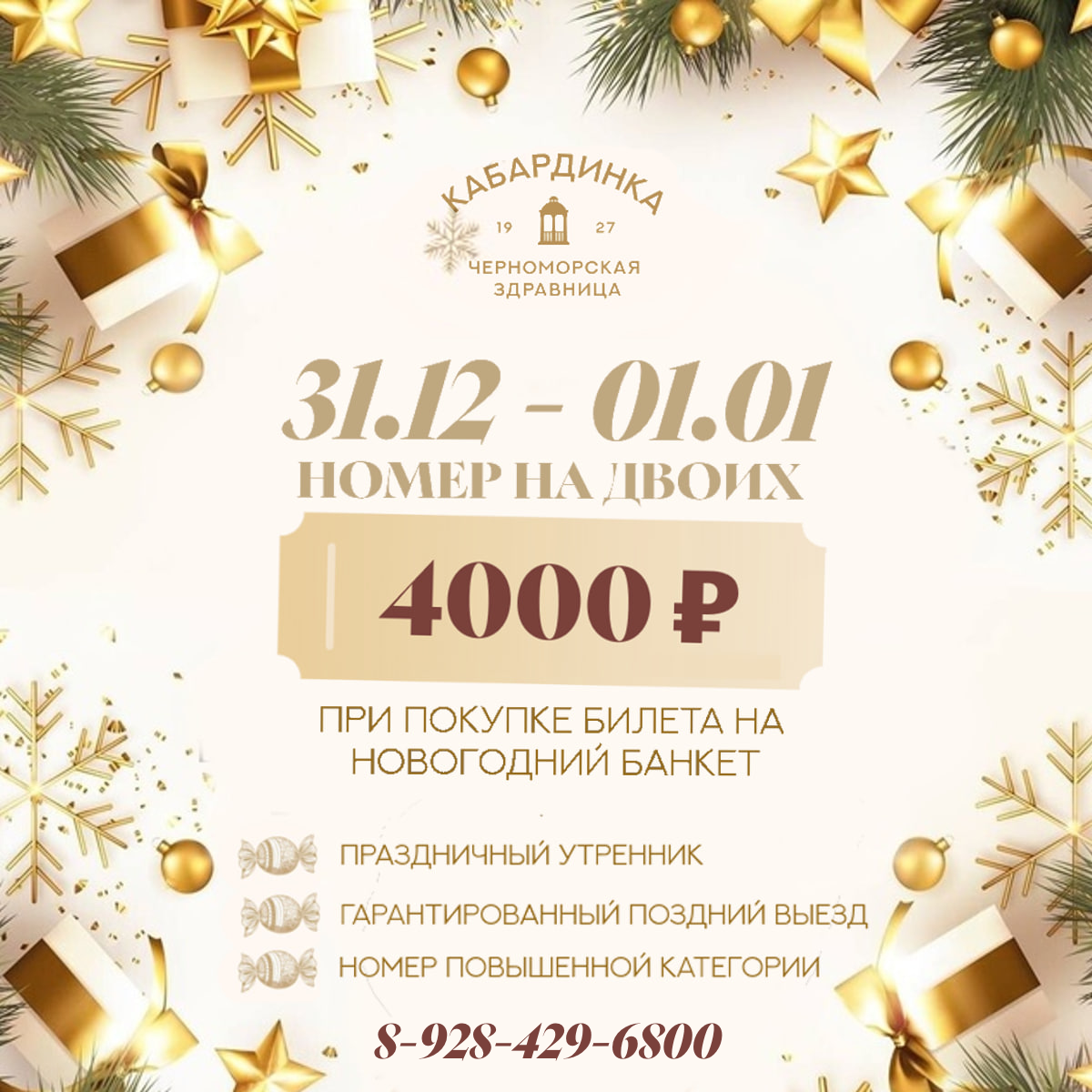 Запускаем волшебный тариф с 31.12 по 01.01. Номер повышенного комфорта 4000 рублей на двоих. Приезжайте в Черноморскую Здравницу дышать морским воздухом и восхищаться красотой первой береговой линии🐬🐚 В тариф включено: 🎄завтрак в ресторане "Клён" 🎄праздничный утренник для взрослых и детей от 3 лет в конференц-зале 🎄гарантированный поздний выезд Тариф действует при покупке Новогоднего банкета по телефону +7 (928) 429-68-00 Погрузитесь в атмосферу зимней Кабардинки и пусть отдых начнётся с заботы о своём здоровье!