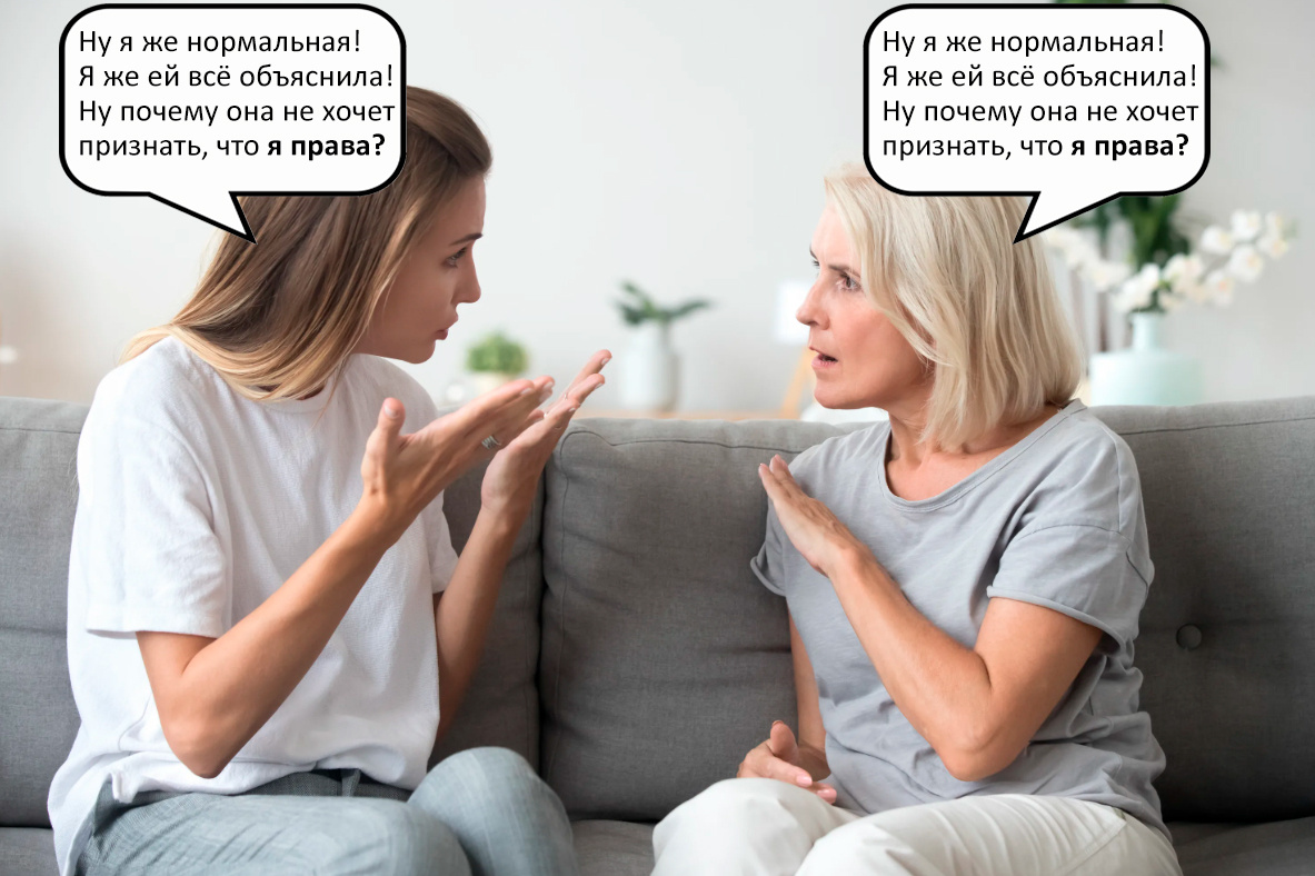 Что мы хотим услышать от человека, когда что-то ему доказываем? Задумывались? Простую и короткую фразу: - Ты прав(а)! И вроде бы ничего сложного в этом не должно быть, но есть один момент, который, очень часто, делает произнесение этой фразы практически невозможным. Дело в том, что "ты прав(а)", произнесённое во время дискуссии, автоматически означает, что "я был(а) не прав(а)". И этот момент всё портит. Особенно, если касается каких-нибудь концептуальных вопросов. Ведь если, скажем, мать признает, что была не права в вопросах воспитания дочери, то на неё может обрушиться груз ответственности за десятки или сотни неправильных решений. Даст трещину или рухнет сама её картина мира, в котором она мудрая, добрая и заботливая мама, которая делала всё для счастья дочери! Возникнут сомнения в объективности своих взглядов и по другим вопросам. Дочь может начать ссылаться на этот прецедент во время будущих разногласий или припоминать что-то при случае. Представили масштабы? А мало кто хочет мен