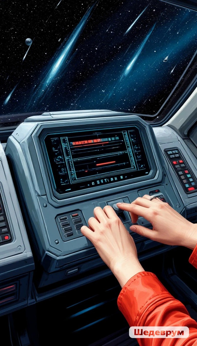 Было видно, как продают тяжёлые предметы, которые похожи на белые капсулы с ручками для того, чтобы было удобно держать прибор в руке. Оливия подошла чуть ближе. На табличке, стоявшей на прилавке значилось: "Прибор для получения звёздной материи" Кто то купил предмет и аккуратно достав из кармана шипы, пересыпал в руку продавца, придерживая второй рукой для того, чтобы ничего точно не просыпалось. Но Оливии это было не нужно, она засунула руку в карман накидки и обнаружила в левом кармане что-то твёрдое, достав, увидела, что это какие-то шипы. Они очевидно были очень дорогие раз здесь ими расплачивались. Она купила корабль, они здесь были устроены на подобии гоночных - обтекаемой цилиндрической формы, заострённый спереди. Для невидимости можно было включить на панели кнопку с надписью "У.П.В.С.". (Усиленное.Поглощение.Всех.Спектров.) У этих кораблей была особенность - поглощая все спектры они становились невидимыми. Она неслась на корабле сама не зная куда. Она думала: "Что ж я делаю, меня послали расследовать дело пропажи космонавтки, а я теперь сама можно сказать "потерялась"" при этом она как то странно улыбнулась, улыбнулась безнадёжно. "Ну и, что мне остаётся делать? Решила же уже всё - исследовать чёрные дыры" ответила она негодующе сама себе. Но в голове её теперь была какая то нерешительность и из-за этого, то она и злилась сама на себя, было что то не то, что вначале. Вначале она подумала и сразу окончательно решилась на это. Она потом не думала об этом ни секунды с того момента как решила всё в мини ракете. Между тем как она раздумывала, она не замечала, что творится перед её носом. Рычажки щёлкали без неё. Она разрешив вопрос наконец, услышала как щёлкают кнопки и посмотрела на них. Творился полный кошмар, они не переставали. Впереди ничего не было видно. Оливия пыталась удержать один из рычагов, но всё напрасно. Она старалась изо всх сил, но пересилить невидимую силу ей не удалось, корабль сделал в воздухе сальто, у миссис Вильсон закружилась голова. Она откинулась на спинку кресла. Её глаза выпучились, корабль летел прямо на огромный метеорит. Она быстро стала выруливать между метеоритами, Оливия попала под метеоритный дождь.