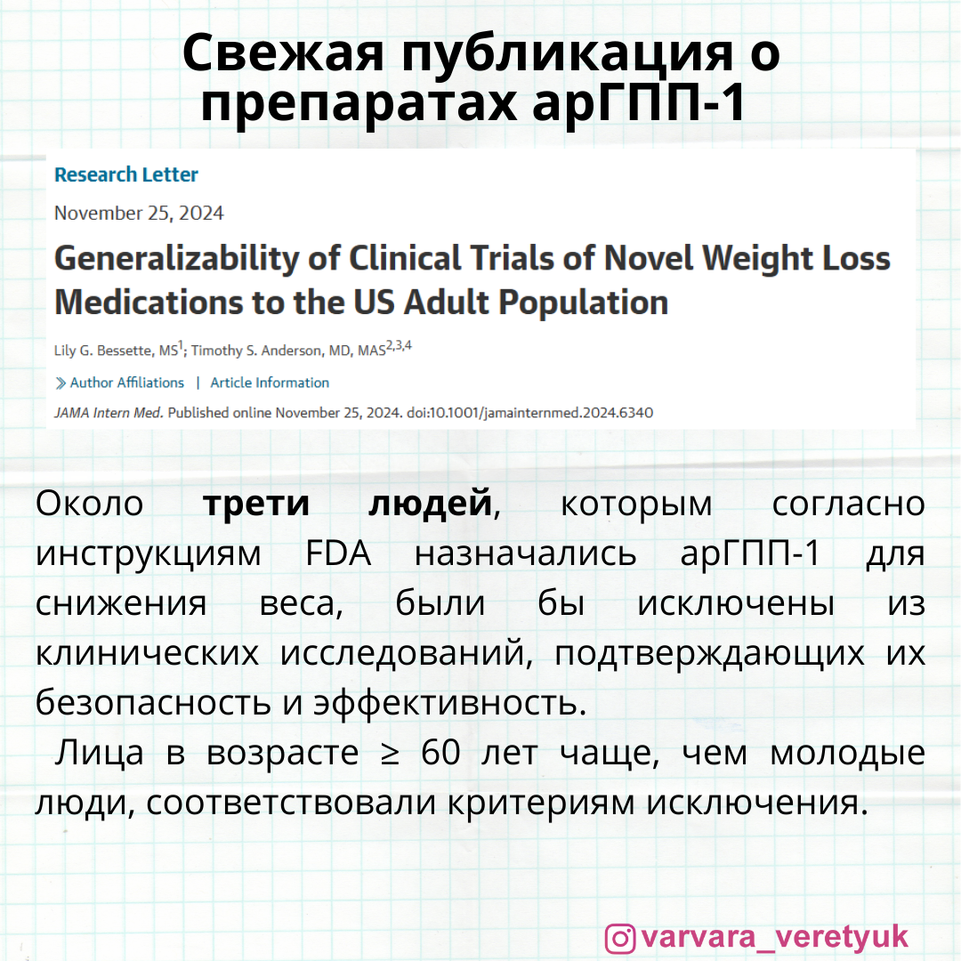 Сегодня я читала лекцию по рациональному назначению лекарственных препаратов и выбору источников информации в работе врача (часть слайдов из лекции вы видите здесь). Рассказала коллегам о свежей публикации (25.11.2024) в JAMA (Журнал Американской Медицинской Ассоциации). Статья отлично иллюстрирует, зачем врачу владеть знаниями о доказательной медицине и уметь читать клинические рекомендации, научные статьи и инструкции к препаратам. Авторы статьи предъявляют претензии к инструкции препаратов арГПП-1 - Лираглутид, Семаглутид и Терзипатид. Широкая общественность их знает как "уколы стройности", и на слуху у многих названия оригинальных препаратов - Оземпик и Мунжаро. Так вот, по препаратам проводились научные исследования, и на основании результатов было выдано разрешение на их продажу и составлены инструкции к препаратам. Но... во время исследований этих лекарств не всех людей с избыточным весом и ожирением допускали в исследование. Был составлен список условий, при которых человека в