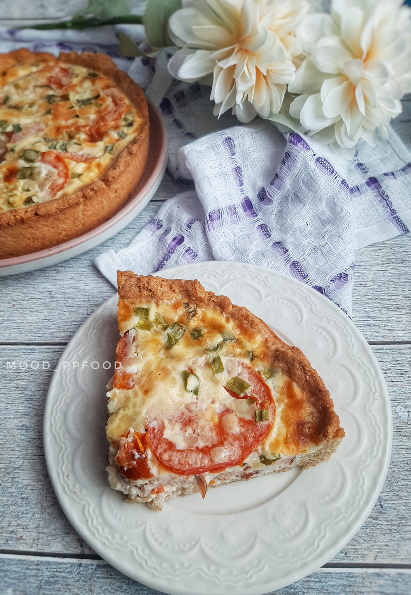 ▫️для теста: Мука Цельнозерновая - 90 г. Мука Кукурузная - 60 г. Яйцо куриное - 1 шт. Масло сливочное 82.5% - 25 г. Сметана 15% - 50 г. Разрыхлитель - 5 г. Соль - щепотка. ▫️для начинки: Копчёная куриная грудка - 150 г. Помидор - 100 г. (1 шт.) Лук зелёный - пара перьев. Соль по вкусу. ▫️для заливки: Сметана 15% - 80 г. Яйцо куриное - 2 шт. Сыр лёгкий - 30 г. Соль по вкусу. 1️⃣ Растапливаем 25 г. масла. 2️⃣ В миске смешиваем 90 г. ц/з муки, 60 г. кукурузной, щепотку соли и 5 г. разрыхлителя. 3️⃣ В другой ёмкости смешиваем растопленное масло, 50 г. сметаны и одно яйцо. 4️⃣ Соединяем сухую и яично-сметанную смесь и замешиваем мягкое, чуть липкое тесто. 5️⃣ Тесто перекладываем в форму для запекания, у меня силиконовая 18 см., формируем бортики и накалываем вилочкой. 6️⃣ Нарезаем куриную грудку и выкладываем на дно нашего пирога. Сверху - ломтики помидора и посыпаем измельчённым луком. 7️⃣ Для заливки перемешиваем венчиком: два яйца, 80 г. сметаны, 30 г. натёртого сыра и подсаливаем п