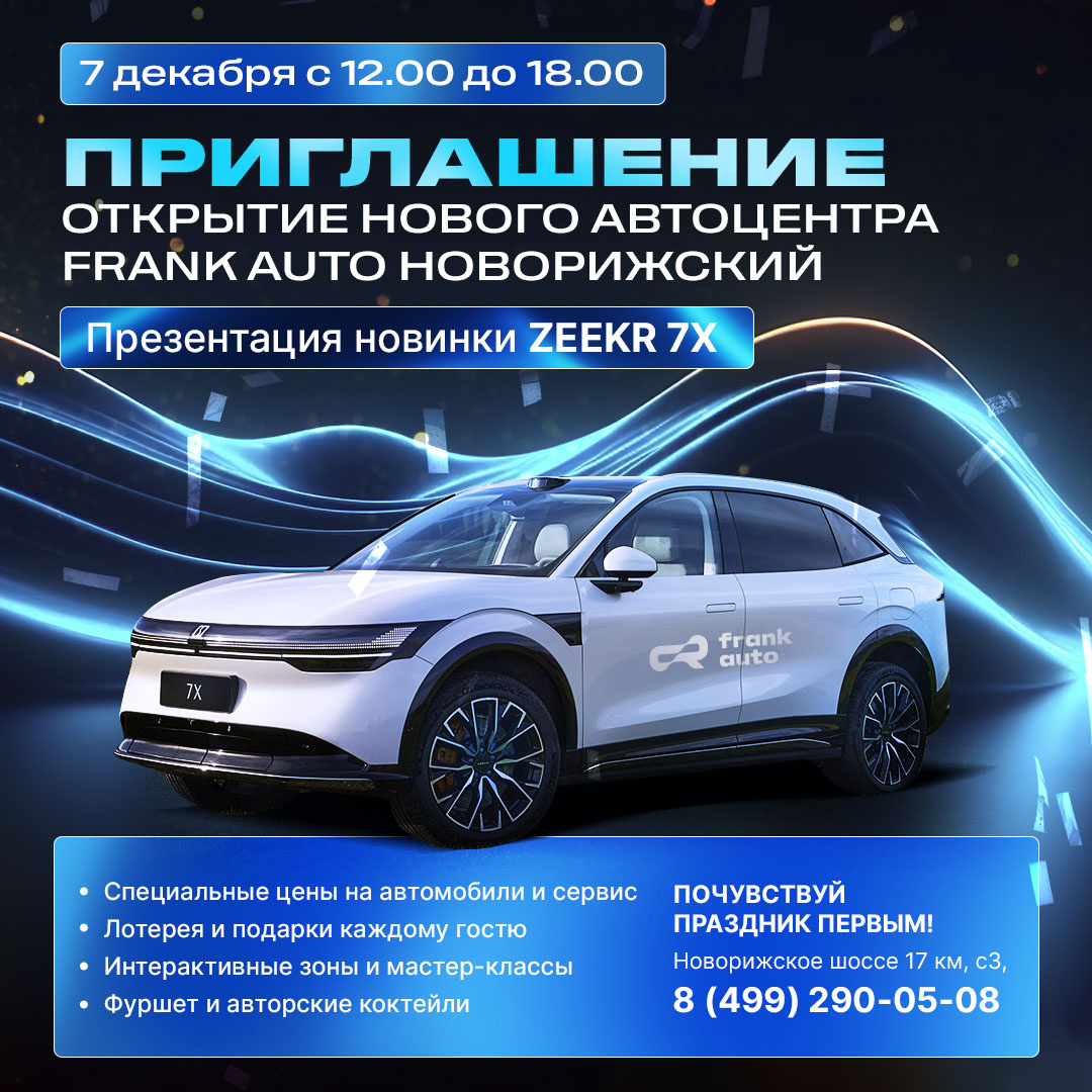 7 декабря в Frank Auto Новорижский состоится грандиозное событие — презентация ZEEKR 7X! ▶️ В ЭТОТ ДЕНЬ ВАС ЖДУТ: • Презентация долгожданной новинки — ZEEKR 7X • Изысканный фуршет и чайный бар с авторскими коктейлями • MIXME-клипмейкер и VK-принтер для создания классных фото и видео на память • Интерактивные зоны для развлечения • Мастер-класс по созданию индивидуального парфюма • Лотерея и подарки каждому гостю ▶️ Специальное предложение от сервисного центра для тех, кто приехал на автомобиле: мойка и считывание кодов ошибок всего за 1 рубль! Также вы можете записаться на сервис на этот день для проведения других работ на особых условиях. FRANK AUTO — ПОЧУВСТВУЙ ПРАЗДНИК ПЕРВЫМ! Ждём вас в автоцентре FRANK AUTO Новорижский по адресу Новорижское шоссе, 17 км, с3, 7 декабря, с 12:00 до 18:00.