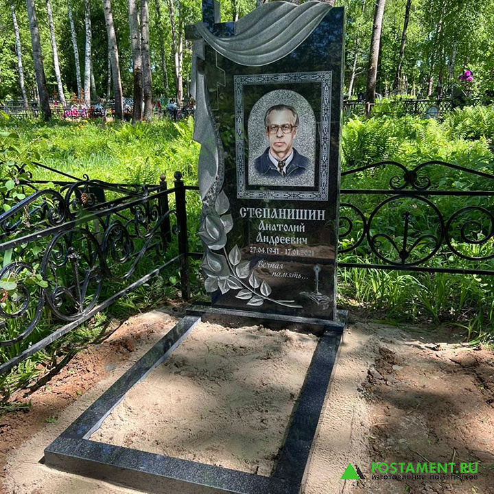 Выбирая памятник на могилу близкого человека, каждый стремится к чему-то особенному, что сможет выразить всю гамму чувств, которые родные испытывают к усопшему. И даже несмотря на то, что в нашем каталоге представлено более тысячи различных моделей, заказчик порой не может определиться с выбором. Отказавшись от традиционных шаблонов, мы предлагаем вам резные авторские памятники на могилу. Искусные мастера, используя различные техники и методики обработки камня, способны создать настоящий шедевр, который не только выразит всю боль и отчаяние, но и передаст любовь и уважение. Перед вами вертикальная модель классической прямоугольной формы, но с оригинальным художественным дизайном. Её верх и левая боковая грань обработаны резьбой, которая создаёт плащаницу, опутывающую перекладину каменного креста. Эта скульптурная композиция символизирует Спасителя и искупление грехов. Снизу, у самого постамента, из камня вырезаны две розы, которые своим светлым тоном красиво оттеняют чёрную гладь плит