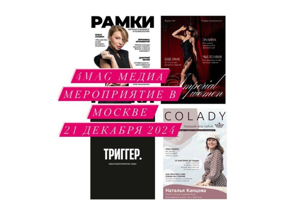 21 декабря 2024 года в 13:00 в премиальном бизнес-пространстве «Ладога» с панорамным видом на Москва-Сити состоится закрытое медиа-мероприятие 4MAG. Это уникальная возможность для экспертов, предпринимателей и PR-специалистов установить ценные контакты, усилить свой личный бренд и открыть новые горизонты для сотрудничества с ведущими глянцевыми изданиями. 4MAG – это синергия четырех топовых журналов, посвященных бизнесу, психологии и личностному росту: Colady, Рамки, Тригер и Imperial Woman. Центральное место в этом объединении занимает журнал Colady – один из лидеров в сегменте онлайн-изданий для женщин. Colady.ru – это не просто журнал, это сообщество более 500 000 читателей в месяц. Входя в ТОП-10 лучших женских журналов России, Colady фокусируется на психологии, красоте и духовности, обращаясь к аудитории успешных, современных женщин 34-55 лет из крупных городов, обладающих высокой покупательской способностью. Издание славится высоким уровнем экспертности, публикуя материалы извест
