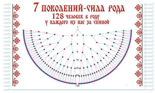 126 человек, именно столько прямых предков насчитывает 7 поколений Рода. Это просто невообразимая цифра, когда начинаешь соизмерять ее с собой. Когда начинаешь сопоставлять свою жизнь и 126 других. А если представить, что Род, как флешка записал на себя весь опыт, полученный этими людьми и заложил его у тебя глубоко внутри, это вообще никак не укладывается в голове.