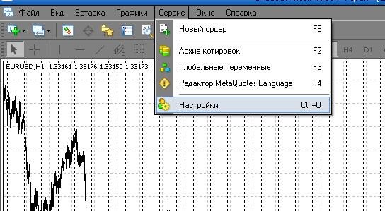 • Оптимизация работы механических торговых систем и советников Шаг 1. Это самый важный пункт, многие о нём не знают, поэтому ничего не получается. Открываете ваш терминал mt4, вводите логин и пароль (чтобы было соединение). Далее в верхней части терминала заходите в «Сервис» и выбираете «Настройки», как показано на рисунке ниже, или нажимаете на клавиатуре «Ctrl+O». В вылетевшем окне настроек выберите вкладку «Графики» как на скрине ниже. Галочки в первых строках не трогаем, а вот в предпоследней строке с названием «Макс. баров истории» проставляем все девятки. Изначально, не поменяв данный показатель, в вашем mt4 не будет показываться полная история котировок. Сделано это для того, чтобы не грузить программу. Проставив максимальное значение – вы это ограничение убираете. В дальнейшем это число изменится, исходя из продолжительности загруженной истории. Нажимаем «Ок» и переходим к сл
