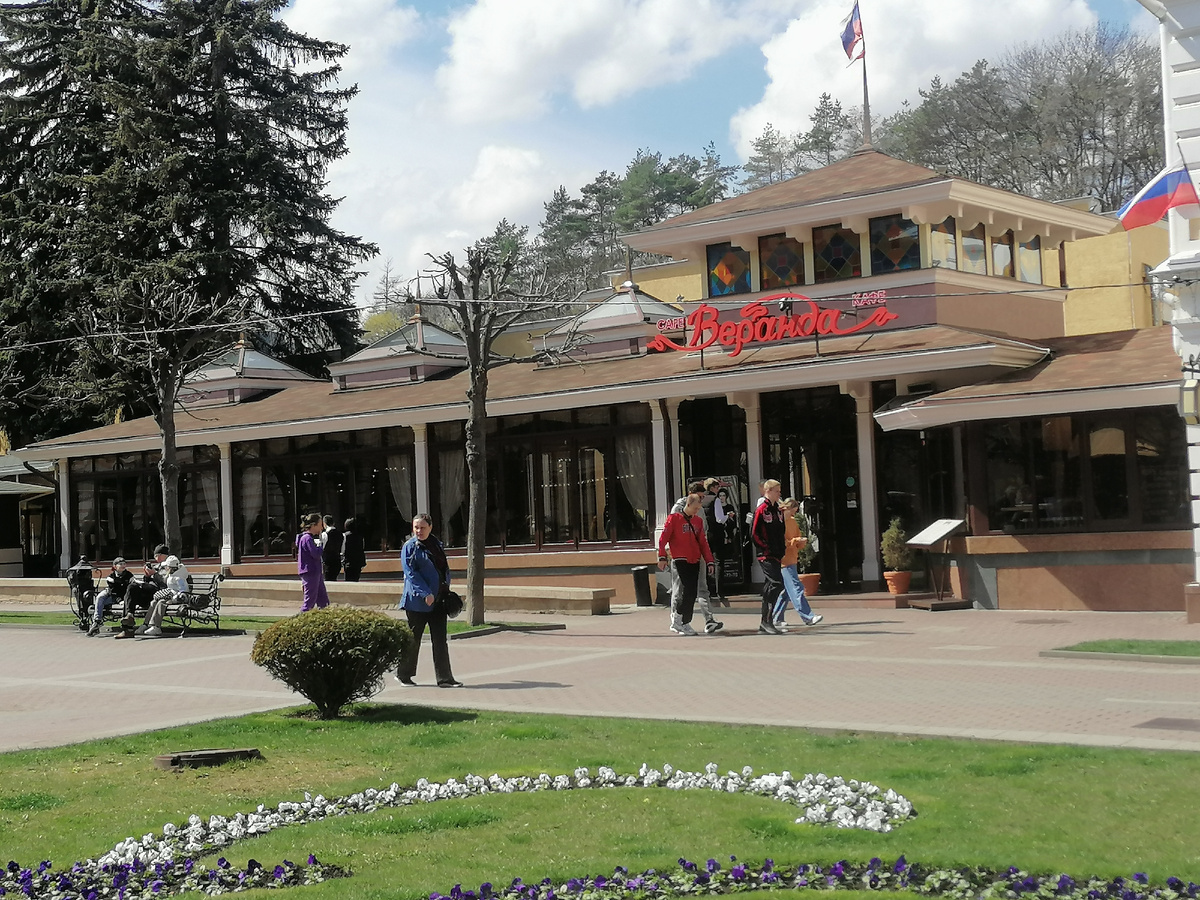 Пересекаем Вокзальную улицу и после сквера с памятником Героям-медикам слева перед нами предстают современные здания отелей Венеция (4 звезды, введено в эксплуатацию в 2008 году) и гостиницы "ПАН-интер" (работает с 2007 года). На противоположной стороне - небольшой сквер с фонтаном, справа от которого здание бывшего Офицерского дома. В 1880-х годах военное ведомство решило выстроить на Кислых Водах здание Офицерского дома. Исходный проект был выполнен петербургским архитектором Христианом Ивановичем Грейфаном. Строительством руководил архитектор Терской области В.И. Грозмани. Офицерский дом имел несколько отдельных номеров, а также общие палаты. Обслуживали больных офицеров солдаты. В 1910-х годах был надстроен третий этаж.