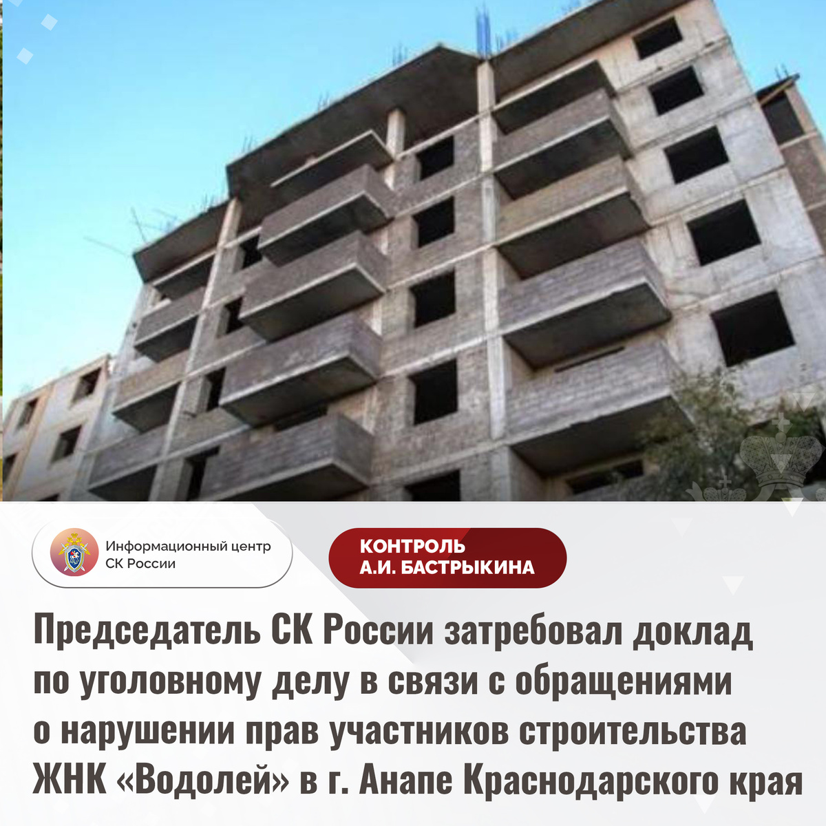 Председатель СК России затребовал доклад по уголовному делу в связи с обращениями о нарушении прав участников строительства ЖНК «Водолей» в г. Анапе Краснодарского края В комментариях в телеграм-канале Информационного центра СК России размещены обращения о несогласии с ходом установления обстоятельств нарушения прав участников строительства ЖНК «Водолей» в городе Анапе Краснодарского края. В 2009 году застройщик ООО «Стройград» начал возведение многоквартирного дома на улице Шевченко, несмотря на отсутствие разрешительной документации. При этом спустя три года работы были приостановлены. Бывший председатель кооператива и его знакомый путем обмана завладели денежными средствами граждан, а взятые обязательства по инвестиционным договорам не выполнили. До настоящего времени пострадавшие, среди которых многодетные семьи и пенсионеры, свои квартиры не получили. Мер к завершению строительства объекта не принимается. Ранее ситуация освещалась в СМИ. А.И. Бастрыкин поручал представить по ней д