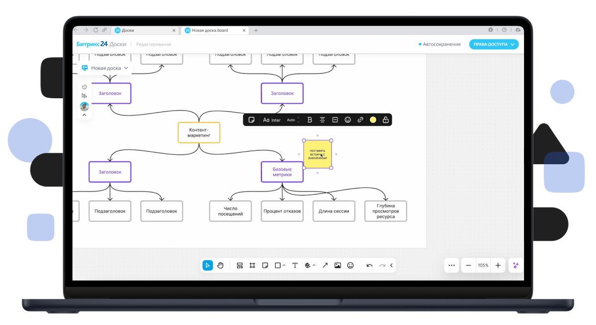 Больше не нужно жонглировать сервисами, раздавать к ним доступы и пересылать неизвестные ссылки Сотни привычных объектов на доске: тексты, картинки, фигуры, слои, группировка и блокировка элементов Создать свой портал и попробовать бесплатно