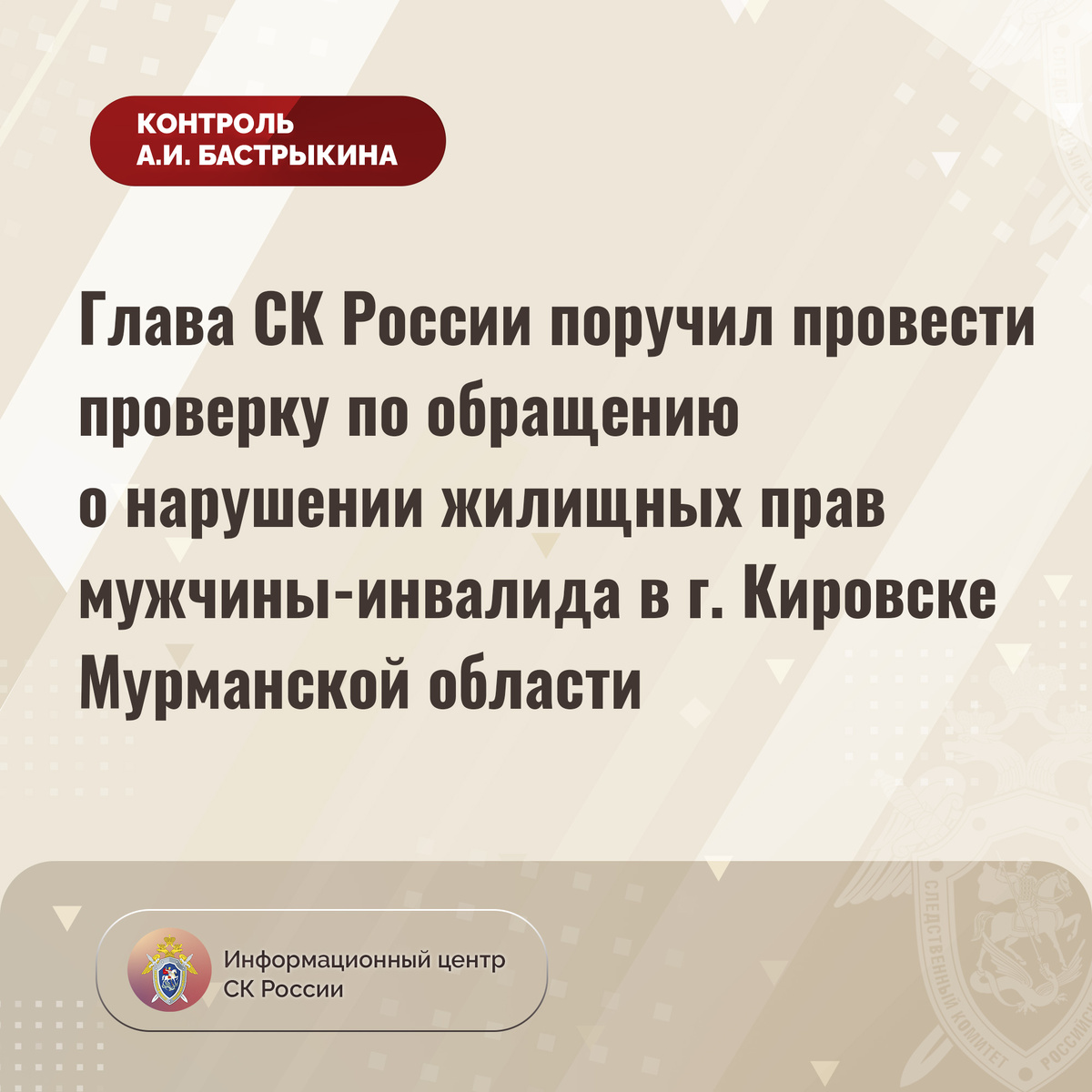 Глава СК России поручил провести проверку по обращению о нарушении жилищных прав мужчины-инвалида в г. Кировске Мурманской области