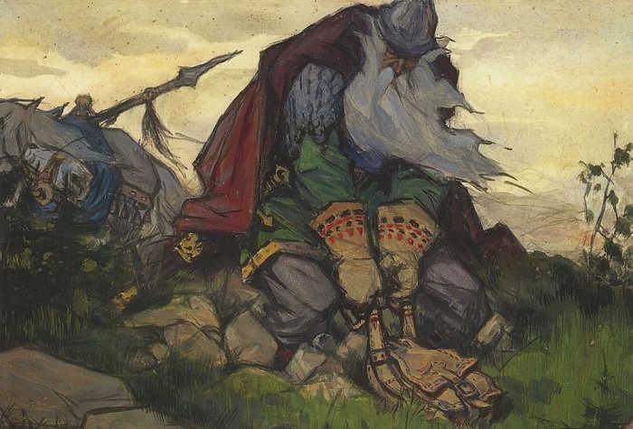 Один из первых героев русских былинных эпосов, богатырь-великан Святогор, сказания о котором вобрали мифы и истории многих народов. Например, схожие ситуации происхождения и жизни богатырей встречаются у народов Кавказа (Сослан), народов Севера (о великане и Торе), в сказках индийцев-буддистов, историях древних персов (например, «Тути-наме»), средневековых литературных произведениях («Калевала», «Римские Деяния»). Почти во всех историях, где фигурирует Святогор, финал предсказуем и печален — богатырь обречен на погибель, на смерть. По мнению ряда исследователей русского фольклора, в частности, советского филолога, профессора Ленинградского Университета В. Я. Проппа, эта обреченность вполне закономерна. По своей сути Святогор является представителем «темного», дохристианского мира. Его мать — Сыра Земля, отец — существо иного мира, тоже «темного». То есть в мире новом, куда стремятся наши предки, к вечной жизни и спасении в Вере, такому персонажу нет места. Он — неприменимая уже первоб