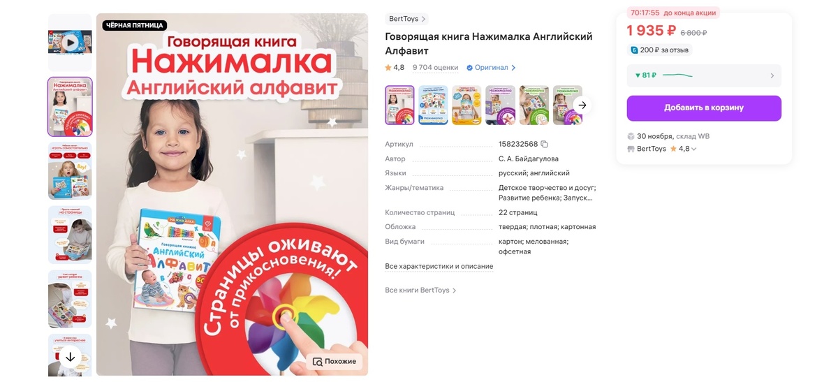 Привет дорогие читатели. Сегодня будет очень интересная подборка, не смогла мимо пройти момо этих товаров, уверена вам они приглянуться😉 Красочная красивая книжка завлекает уже с первых страниц. Изучать английский язык ещё ни когда не было так интересно. В книге 22 страницы на разворотах которой 500 фраз и заданий. Под каждым английским словом перевод на русском, а чтобы правильно произносить слова, они озвучены профессиональным диктором, нужно просто активировать страницу. Громкость озвучки регулируется на каждой странице. Книга выполнена из плотного картона, заряжается от USB-кабеля, подходит деткам в возрасте от 2 до 6 лет. Артикул: 158232568 Раньше, я относилась к таким отпаривателям скептически, после того, как увидела этого малыша поняла, что сильно ошибалась. Несмотря на свой компактный размер, этот чудо-прибор способен отпарить вертикально, горизонтально, отгладить вещь, а также продезинфицировать. На отпаривателе присутствует дисплей, на котором вы увидите таймер с обратным