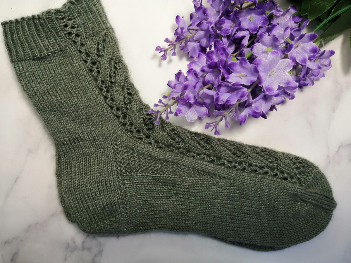 Добрый день, друзья! Как обещала, делюсь с вами описанием женских носочков спицами. Связаны носочки лицевой гладью с ажурной вставкой по передней части. В работе использовала носочную пряжу от Ализе и спицы 2,5 мм. Пряжа: Alize Superwash Artisan Состав: 75% шерсть, 25% полиамид Метраж: 420 м на 100 г Цвет: 274 Вес носочков - 60 г, размер - 38. На спицы набрать 64 петли усиленным эластичным набором и вязать резинку 1х1 со скрещенной лицевой петлей, вписывая ажурную дорожку. Распределить петли по передней части так: По задней части носочка вязать просто резинку 1х1 со скрещенной лицевой петлей. Вязать резинку на необходимую высоту и перейти на паголенок с ажурным узором впереди, вписывая его в схему узора. Раппорт узора состоит из 25 петель и 12 рядов, остальные петли все вязать лицевыми. Вязать на ту высоту, которая вам необходима. У меня высота паголенка вместе с резинкой составила 12 см. Далее вяжем пяточку - подкову на 32 петлях, соблюдая симметрию узора. Заднюю стенку пятки вяжем н