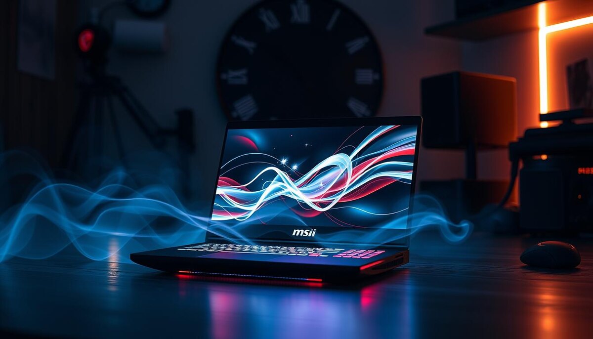 A futuristic gaming software interface displayed on a sleek MSI Katana laptop, featuring vibrant colors, dynamic graphics, and high-tech visual elements, set against a dark gaming environment with ambient lighting, showcasing performance metrics and game optimization tools.