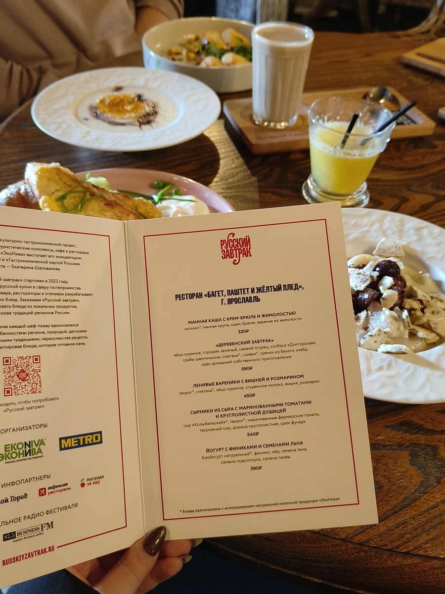 Фестиваль «Русский завтрак» радует разнообразием меню. Всегда интересно, когда традиционные блюда подают с необычными акцентами. Сегодня мой обзор из ресторана «Багет, паштет и желтый плед». Ну что, начнем! На столе — всё, что нужно для хорошего утра. Манная каша с крем-брюле и жимолостью. Для меня было очень сладко, но сочетание текстур — интересное. Йогурт с финиками и семенами льна. Лёгкий и натуральный, чувствуется сладость фиников. Приятный вкус, но без вау-эффекта. А этот напиток приносят в дополнение к завтраку. Он состоит из цикория и ячменя — альтернатива кофе. Ленивые вареники с вишней. Подача просто вау! На вкус — чуть проще, чем на вид, но мне понравилось. Сырники из сыра с маринованными томатами и душицей. Реально очень сырные, подаются с рукколой и творожным сыром с травами! Деревенский завтрак — мой фаворит! Всё, что нужно, чтобы начать день сытно и вкусно. Каждое блюдо добавляет свою нотку в общее впечатление. Фестиваль действительно удивляет! А заведение называется «Б