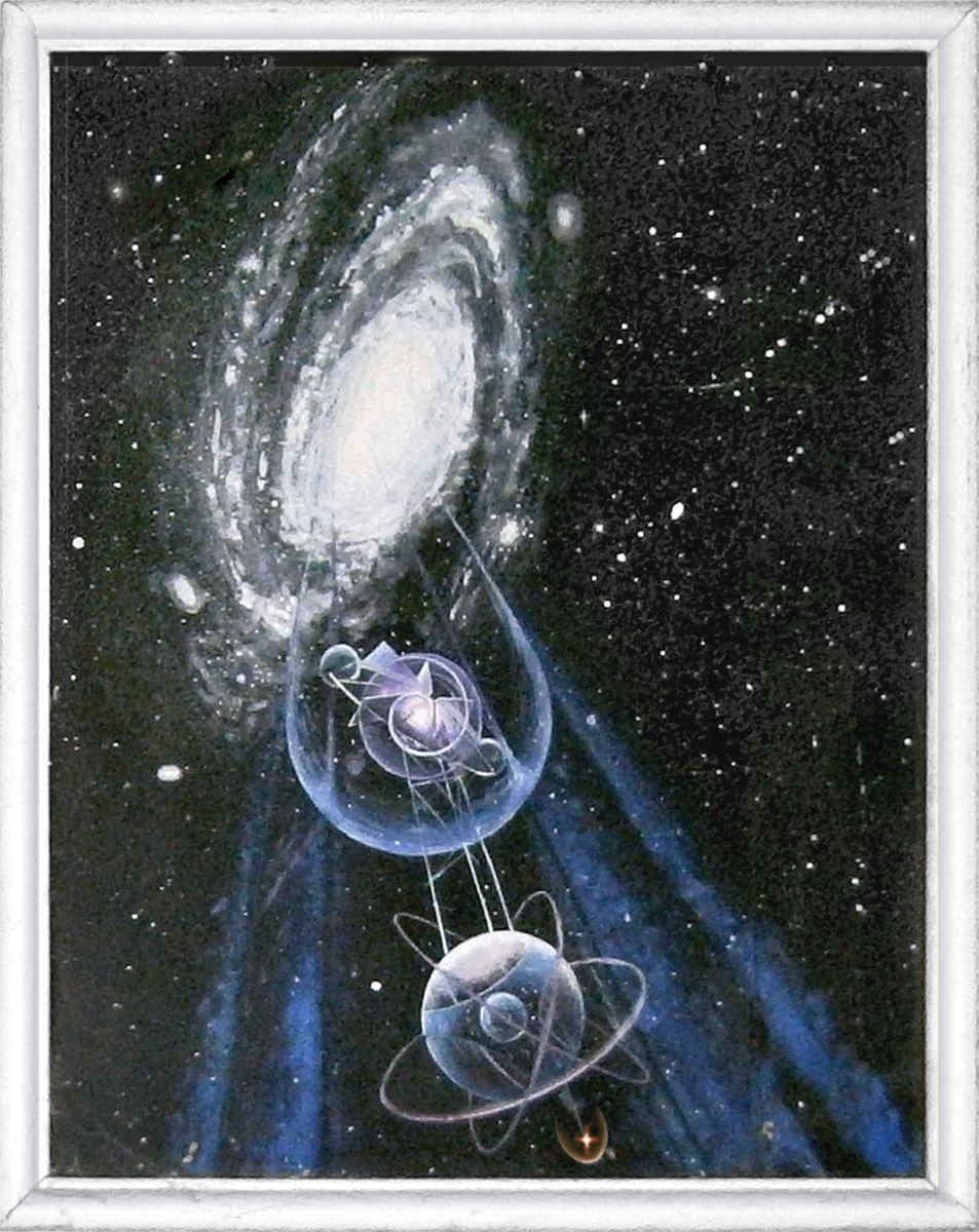Друзья, эта картина написана мной в 15-16 лет, на конкурс в художественной школе в 1990-м году? На ней изображён огромный звездолёт, размерами в десятки, а может и больше километров. Улетающий из нашей галактики "Млечный путь" в просторы дальнего межгалактического космоса. Это очень далеко, в миллионах световых лет от Земли, при этом цель полёта мной так и не осмыслена. Кажется, что мотив работы отражает идею романа И. А. Ефремова "Туманность Андромеды", а может, что-то иное, экспансию человечества в другие галактики Вселенной. Картина написана в ожидании чуда, якобы пришествии Ксенай на космических кораблях в 2002 г., Ксенаи - астрально-эфирные тонкоматериальные сущности, потому на картине они в скафандрах, какие позволяют спуститься к нам в материальный мир. Конечно, когда время пришло, никто не спустился, на что я был разочарован в своей вере, но тем самым вера обрела более реалистичные очертания. Что Ксенаи не прилетают к нам от просто так, а только по особому случаю, и, как правил