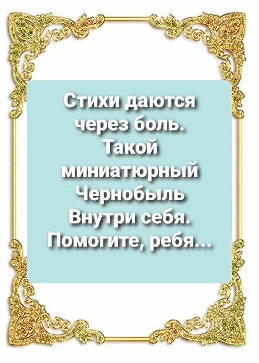 Стихи даются через боль. Такой миниатюрный Чернобыль Внутри себя. Помогите, ребя... Скатывается с губ слово, Как с ветки яблоко наливное. Ударяется оземь О жёлтую осень. Так складывается мозаика букв И развевается белым клобук Прекраснейших рифм На чёрный шрифт. В грудине рождается зуд. Стихи на бумагу ждут. Переползают каплями, Перелетают цаплями На снежную фату листа С скорпулёзной точностью окулиста. Буква за буквой: За здравие и за упокой.