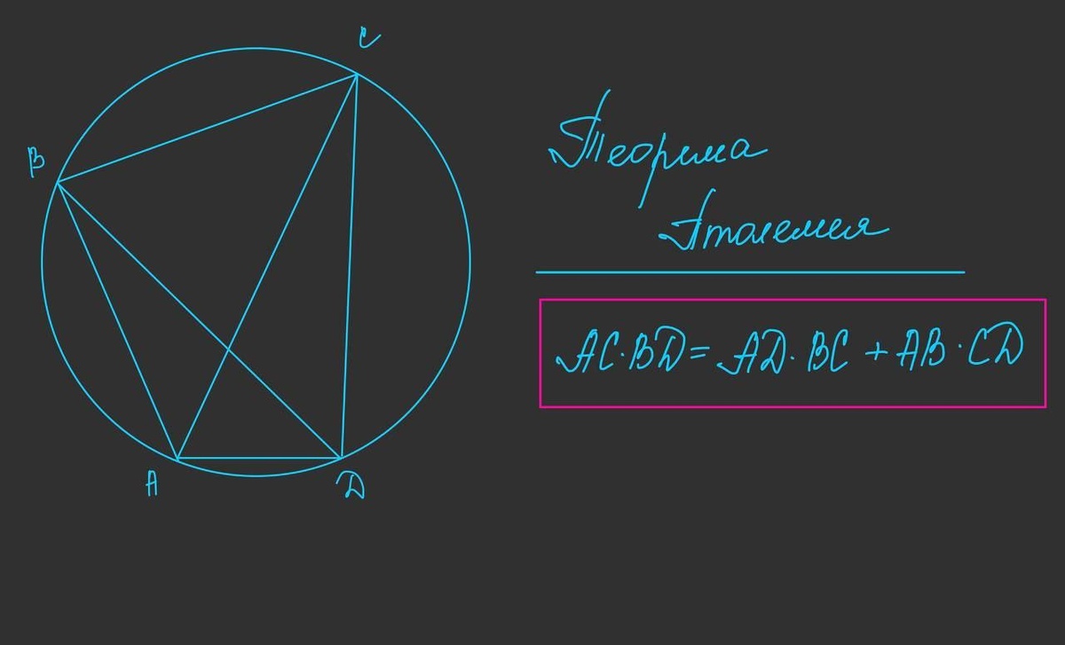Безусловно, самая полезная во всём курсе геометрии теорема — теорема Пифагора. Отсюда логично сделать вывод о том, что она и самая крутая, но... нет Птолемей покруче будет. Почему? Потому что из Птолемея выводится Пифагор Давайте разбираться. Вот теорема Птолемея на картинке. Во вписанном четырёхугольнике получается такая ситуация, что произведение длин диагоналей равно сумме произведений противоположных сторон.