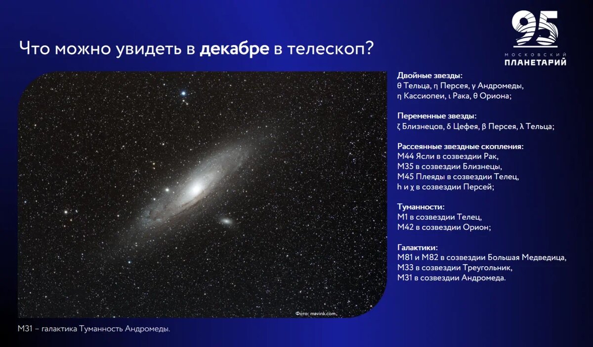 двойные звезды: ι Рака, θ Ориона, θ Тельца, η Персея, γ Андромеды, η Кассиопеи; переменные звезды: ζ Близнецов, δ Цефея, β Персея, λ Тельца; рассеянные звездные скопления: Ясли (Рак), M35 (Близнецы), Плеяды (Телец), h и χ Персея; туманности: М1 в созвездии Телец, М42 в созвездии Орион; галактики: М31 в созвездии Андромеда, М33 в созвездии Треугольник, М81 и М82 в созвездии Большая Медведица.