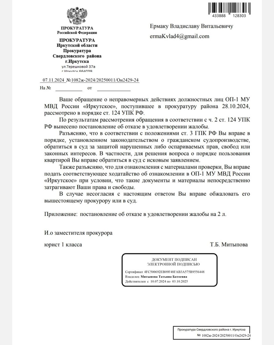 После того, как мать сменила замки я написал заявление в полицию и прокуратуру о правонарушении гражданских прав и бездействия сотрудника полиции. Расписал я в целом около 10 листов для двух заявлений и получил наконец-то долгожданный ответ от МВД России и Городской Прокуратуры. По двум заявлениям отказ.🤥 Отказ с интересной формулировкой - было проведено расследование в ходе которого не были выявлены правонарушения. Я в принципе другого ответа не ожидал. Интересно правда, как проводили это "расследование".😅 Хотелось бы взглянуть хоть одним глазком, ибо в полиции я даже показал видео подтверждения правонарушения. Но речь не об этом. Пусть такие поступки правоохранительных органов останутся в глубине души. В какой-то момент я отчаялся, Т.к. у меня нет понимания и знаний куда и кому писать, чтобы решить эту проблему.🤯 Внезапно через социальные сети я нашёл юриста из Иркутска, бывшего полицейского. Мы договорились о встрече в центре города в офисе.
