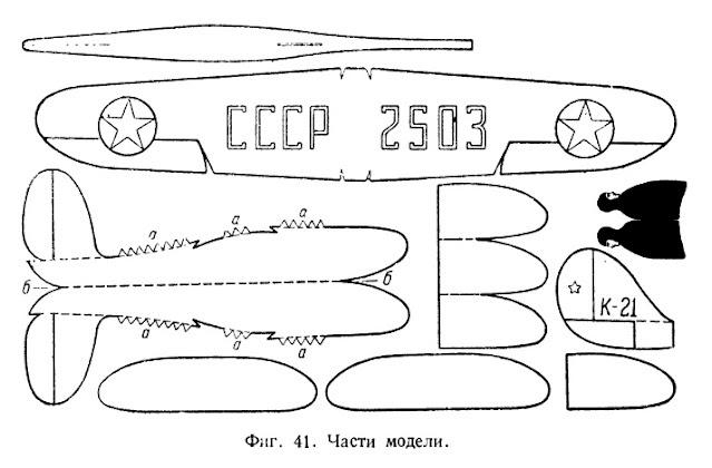 Эта модель (фиг. 41 и 42) сложнее предыдущих. В ней больше деталей, они требуют более тщательного изготовления. Прежде всего нужно точно вычертить части модели (фюзеляж, крыло, киль и т. д.). На фиг. 41 эти части уменьшены в 2 раза. Нужно при помощи линейки, Циркуля и карандаша начертить детали модели в натуральную величину- Фиг. 41. Бумажная модель планера Процесс изготовления модели не так уже сложен. Первоначально сгибаем фюзеляж по линии б—б и отгибаем стабилизатор книзу (фиг. 43, Л). Затем намазываем клеем с двух сторон нижнюю часть киля (на фиг. 43 заштрихована) и вставляем киль в фюзеляж. Для того, чтобы киль хорошо приклеился к фюзеляжу, нужно на некоторое время нижнюю заднюю часть фюзеляжа держать зажатой пальцами. В переднюю часть фюзеляжа вставляем груз и укрепляем проволочный крючок, необходимый для запуска модели.