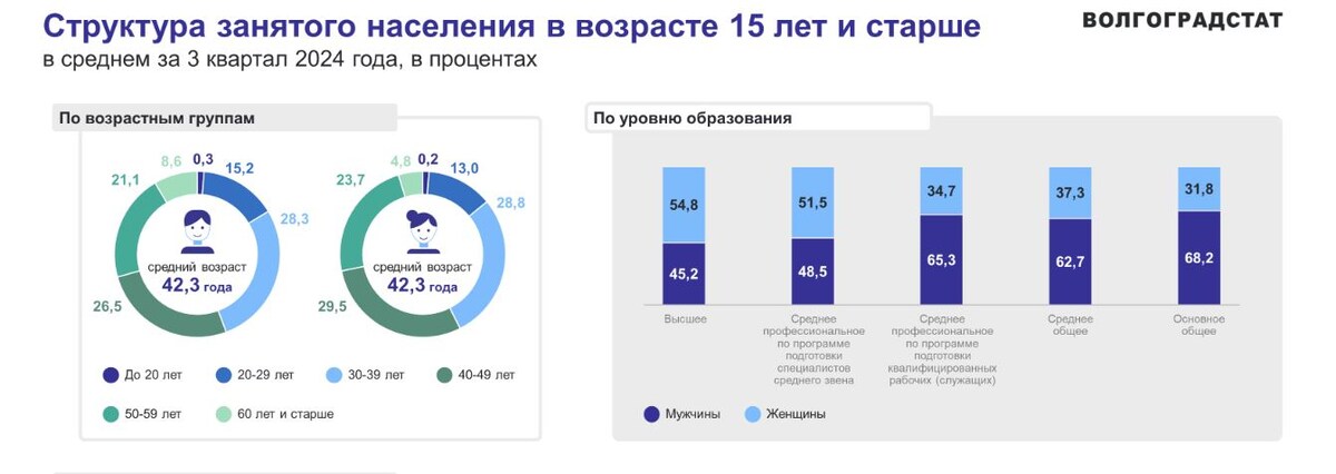 Численность занятого населения Волгоградской области в возрасте 15 лет и старше составила 1255,7 тысяч человек. Такими цифрами поделился Волгоградстат. Известно, что из указанного числа работников 94,1% находятся в трудоспособном возрасте, при этом, сюда же включили подростков. Численность населения Волгоградской области по данным Росстата на 2024 год составляет 2 453 898 человек. Средний возраст занятых в экономике жителей региона составил 42,3 года. При этом около 9% работающих мужчин и почти 5% женщин — старше 60 лет. Волгоградцы отдают предпочтение при трудоустройстве предприятиям и организациям со статусом юридического лица. При этом только у 54% женщин и 45% работников-мужчин есть высшее образование. В отраслевой структуре занятого населения наибольшая доля приходится на оптовую и розничную торговлю, ремонт автотранспортных средств и мотоциклов — 16,9% и на обрабатывающие производства — 12,5%. Также в числе популярных отраслей — образование, охота и рыболовство. Напомним, к концу