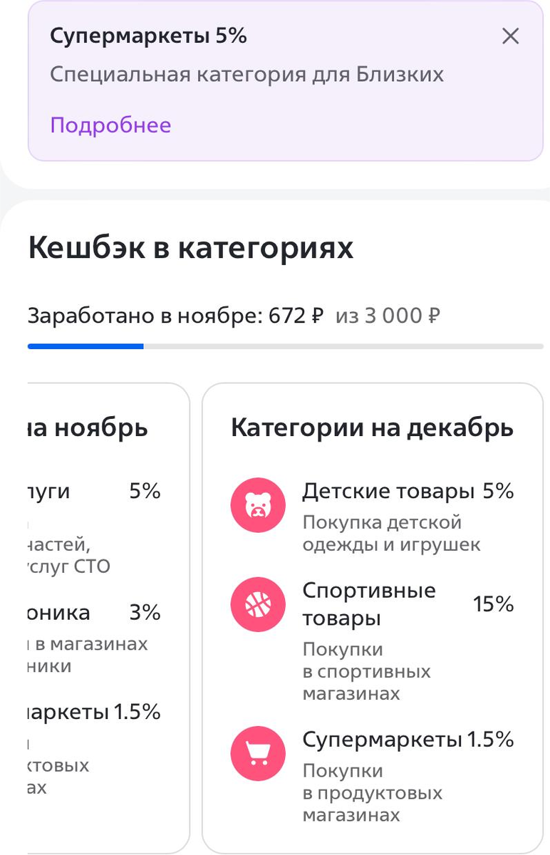 Вот теперь можно сказать, что выпали категории, которые покроют все базовые потребности человека. С 1 числа месяца начинаю тратить 5000 руб. на продукты с карты Газпромбанка, чтобы получить 1000 баллов. Правда компенсировать получается через 2 месяца. Но пока дают - бери! Затем перехожу на ВТБ. За приглашение друга в группу близкие дали 5% на супермаркеты + 1,5% выбрала в категориях. В итоге 6,5% на супермаркеты перед Новым годом очень даже неплохо. Альфа все чаще подсовывает свои сервисы, возможно воспользуюсь только доставкой из перекрестка. На Озон выпало 25% на развлечения, я не покупаю сертификаты, если получится, то потрачу на детские развлекательные центры. Ну и аптеки в декабре точно пригодятся. Т-банк вернул 5% на красоту, в последнее время не было. Ну и одежда пригодится, хоть я почти все заказываю на WB. Еще бывает хороший кэшбэк на доставку, Ашан, Магнит, Пятерочка - 15-20% Получила карту от АТБ. Пластик готовился почти 14 дней. Забирала в офисе, никаких доп. услуг
