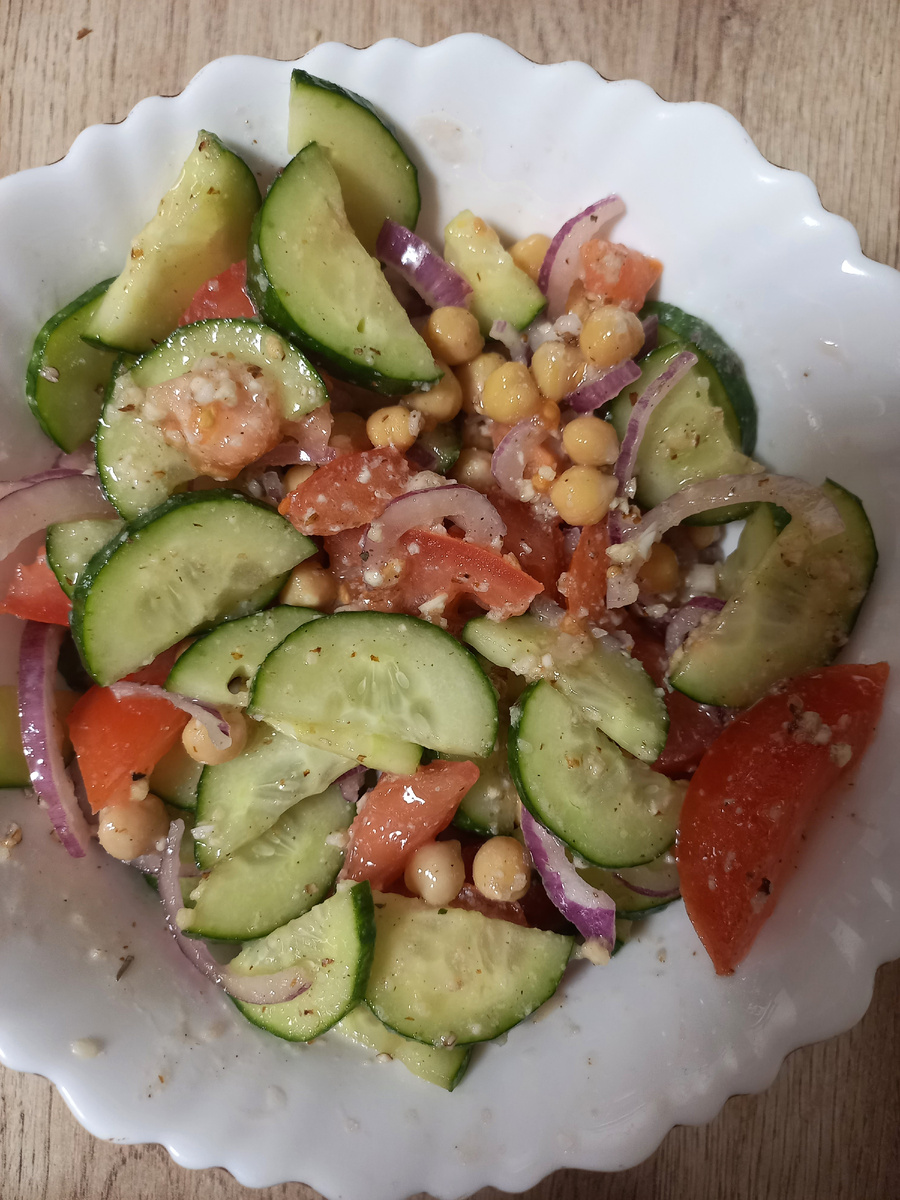 Всем привет! Сегодня рецепт привычного нам салата из помидоров и огурцов, но я немного его "обыграла" добавив в него нут и грецкий орех. Салаты из бобовых представляют собой вкусную, полезную и питательную закуску. Бобовые продукты имеют высокую питательную ценность, такой ингредиент с лёгкостью может заменить мясо. Это обусловлено тем, горох, фасоль, нут и чечевица — все они богаты белками растительного происхождения. Также в бобовых содержатся микроэлементы, клетчатка, пектины, аминокислоты, витамины (А, В, С, РР) и ферменты — все они приносят пользу нашему организму. Если периодически вводить в свой рацион салаты из бобовых, то они принесут пользу для многих органов — в первую очередь для желудочно-кишечного тракта и сердца. Также бобовые положительно влияют на нервную систему. Поэтому, что бы быть здоровыми и в "форме" практикуем вводить в меню салаты из бобовых. Способ приготовления: В салате я использовала консервированный нут (покупала в магазине "Магнит") , но можно