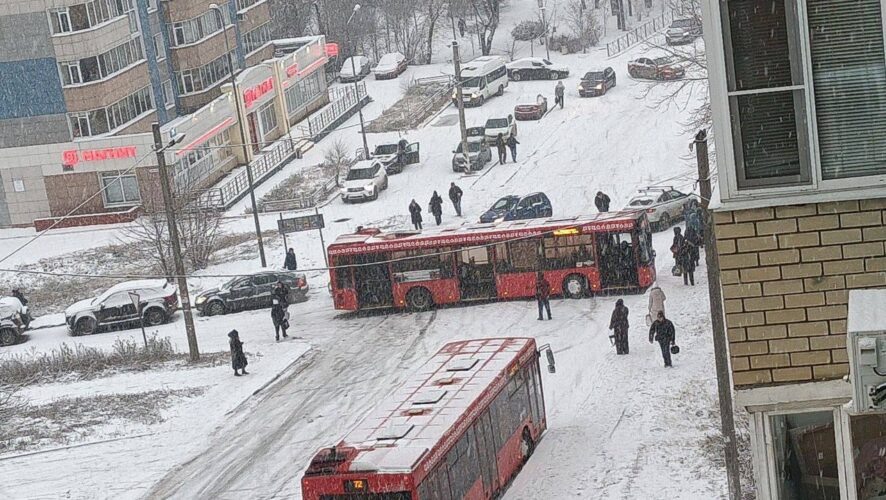 Многочисленные аварии произошли сегодня утром из-за мощного снегопада, который накрыл утром Казань. Массовая авария с участием 7 автомобилей случилась на улице Айвазовского. Судя по кадрам, на скользкой дороге машины не успевали затормозить и врезались друг в друга по принципу домино. В поселке Юдино напротив дома №8 по улице Нижняя автобус не справился с управлением и его развернуло поперек дороги. Движение на этом участке заблокировано. На проспекте Победы у перекрестка с улице Глушко автомобиль вылетел с дороги и врезался в опору надземного пешеходного перехода. В районе соцгорода автомобиль снес дорожный знак и застрял на трамвайных путях. Серьезное ДТП с фурой и несколькими легковушками произошло утром на подъезде к Зеленодольску. Большегруз развернуло поперек дороги.